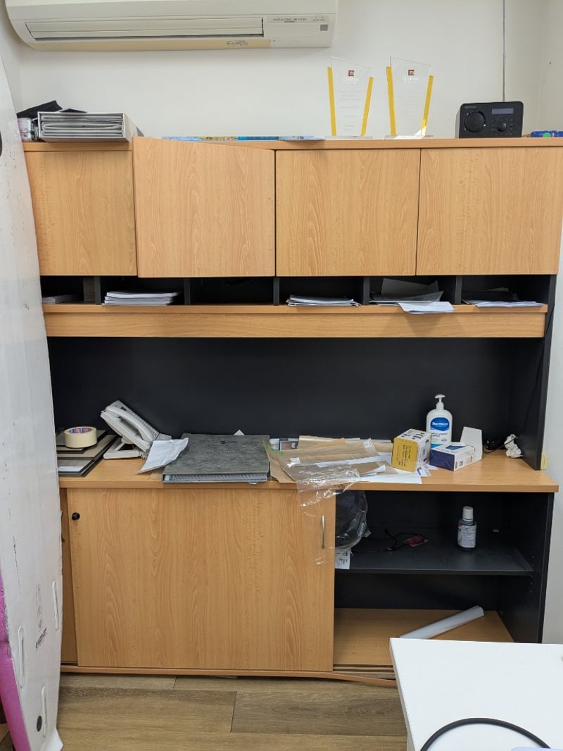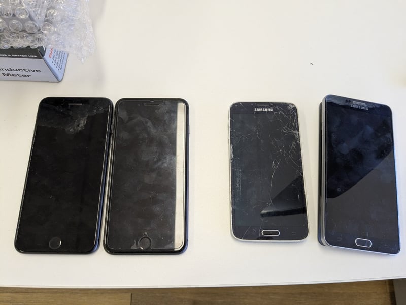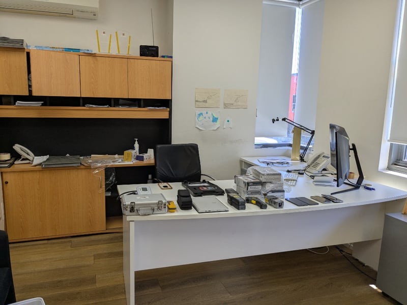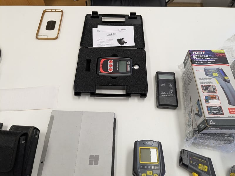 Lot of assorted items including:1.Corner workstation, office chair, pedestal, 2-door credenza with hutch.2. Apple iPhone 7 Plus, black, 5.5" multi-touch display3. Samsung Galaxy A5, silver, 5.2" multi-touch display (1x cracked screen)4. Microsoft Surface 3, 64gb, 10.8" 1920x1280 touch display, keyboard, S/N: 019128751152.5. NDI KC-180A, handheld, LCD6. Flir MR160, handheld, LCD, S/N: 11-MR160-00044237. NDI KC-318, handheld, LCD8. Wagner MMC 220, handheld LCD9. Romus Protimeter Mini 93250, handheld, LCD, S/N: JCBLD2000-RO03Q00061 and more....Note: Signs of wear and tear, untestedSold as a lot
