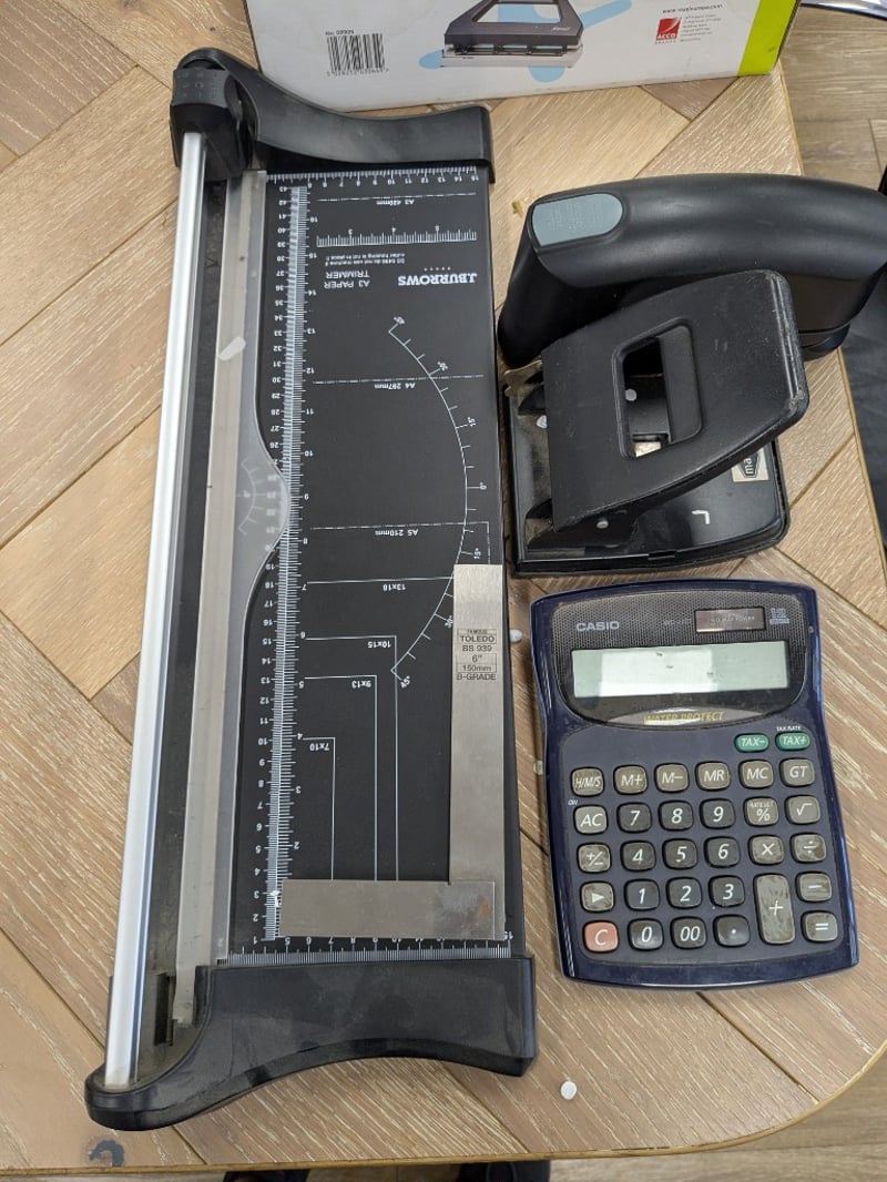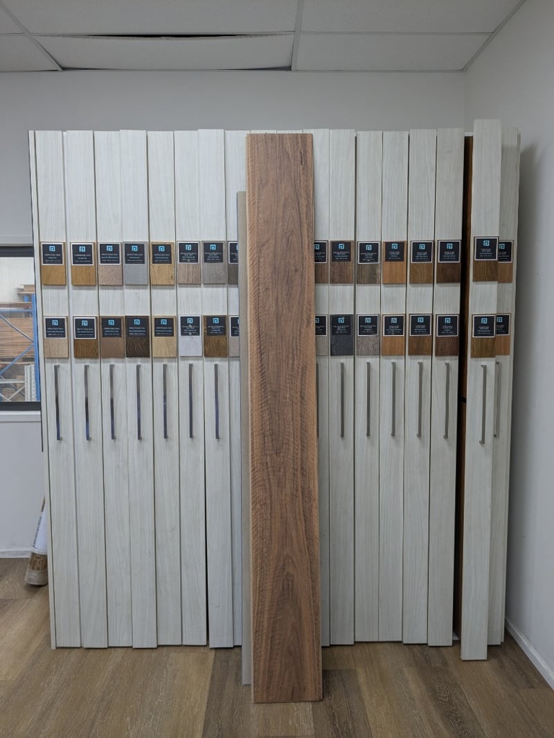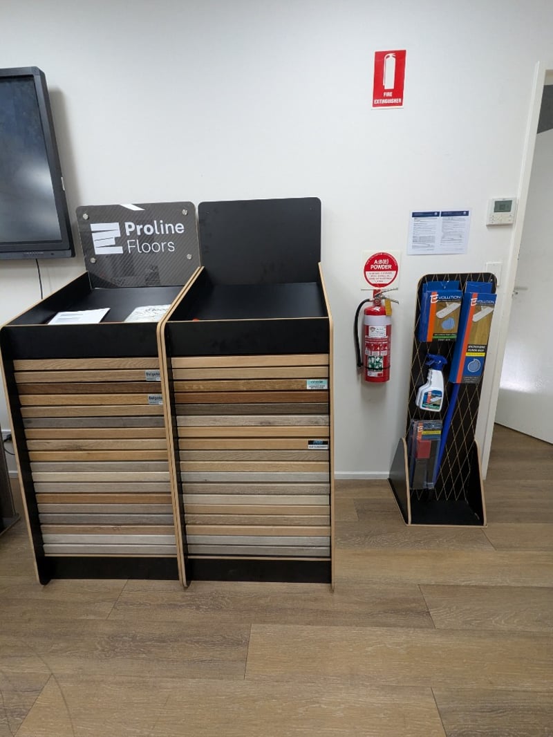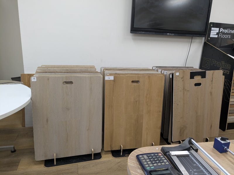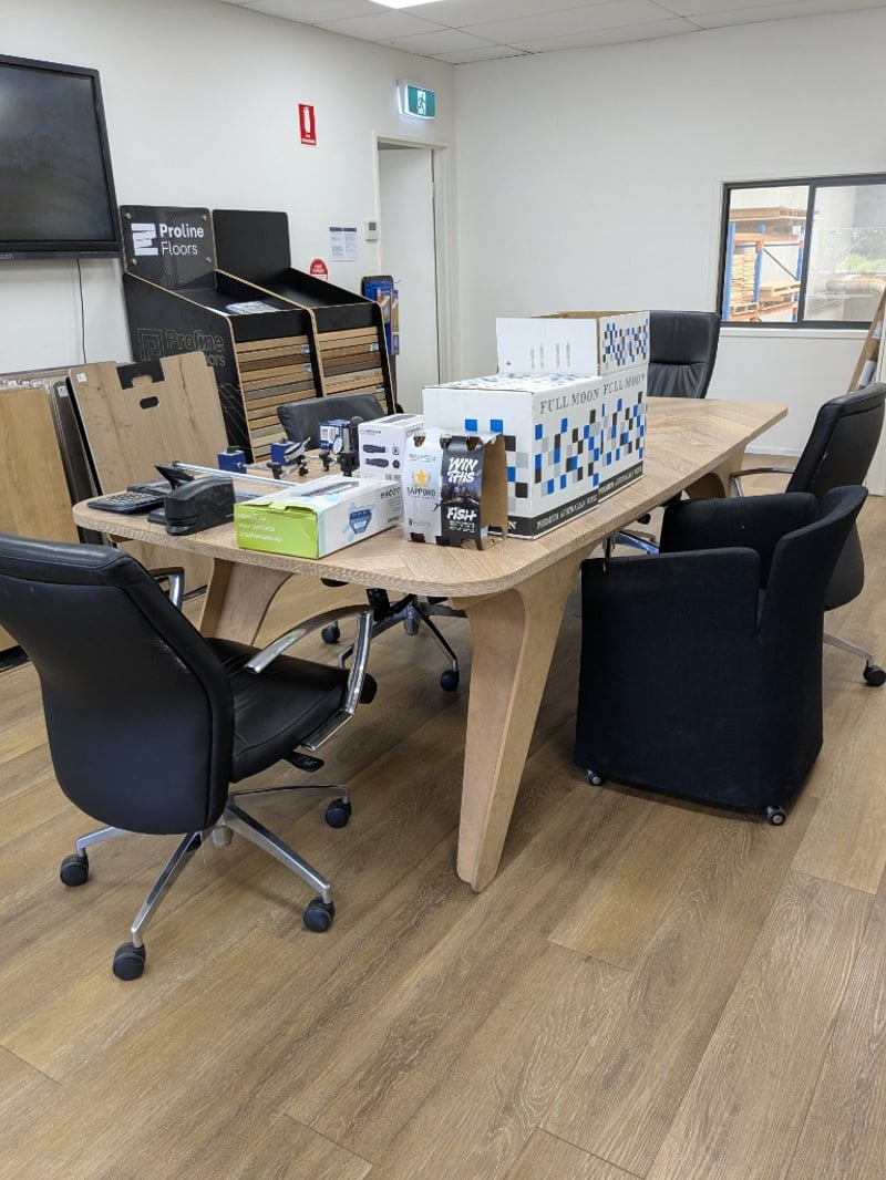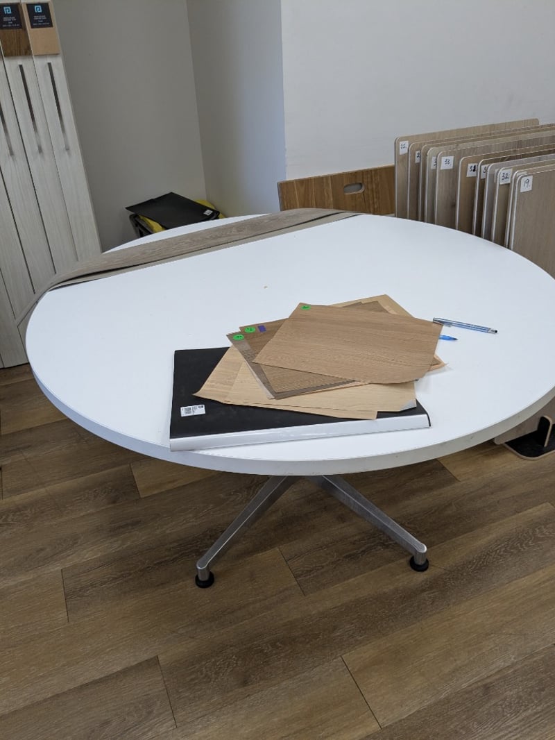 Lot of assorted items including:1. Including parquetry/MDF meeting table, 2x circular laminate meeting tables, 5x chairs2. Assorted flooring samples display 3. IG-Touch IGT55E8516090031, touchscreen, 55", wall mounted, S/N: not accessible and more...Note: Signs of wear and tear.Sold as a lot.