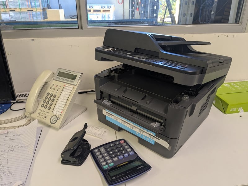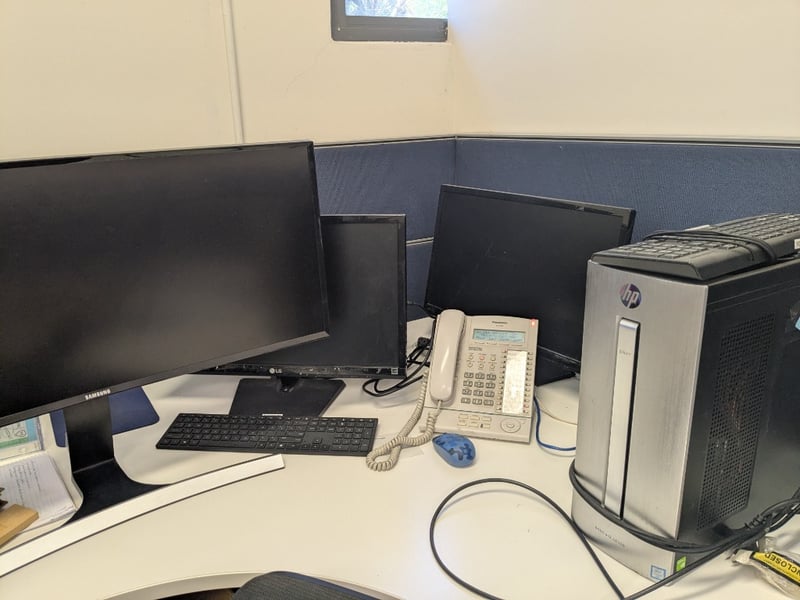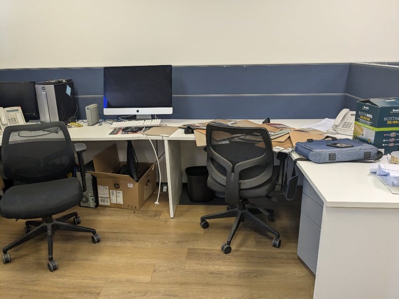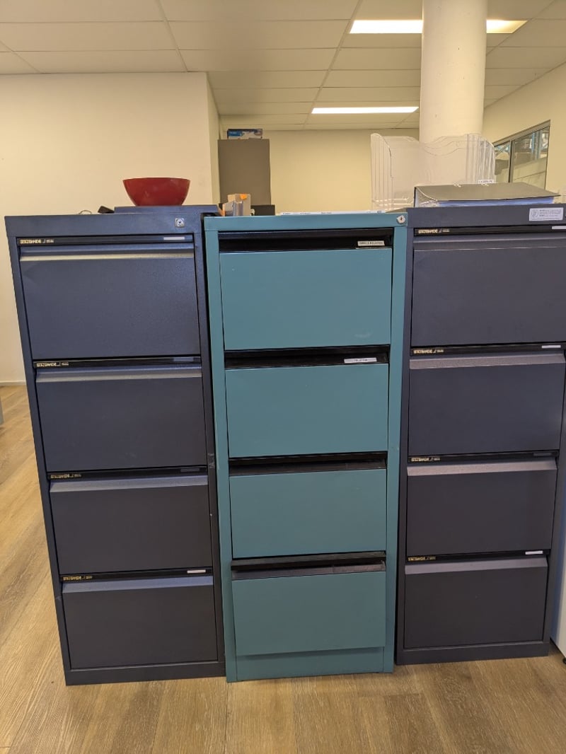 Lot of assorted items including:1. Modular, seating for approx. 8 staff, white laminate curved corner worksurfaces, blue fabric upholstered grey steel frame privacy screening, grey steel 3-drawer mobile pedestals, handing shelves.2. Allowance for all other furniture to area including 5x office chairs, 4-drawer filing cabinets, 2-door cupboard and sit/stand desk3. Brother MFC-L2700DW, mono, laser, 26ppm, ADF, S/N: E74252A5N765628.4. Apple MacBook Air model A1466, 13.3" 1440x900 display, est. Core i5 @ 1.8GHz processor, DOM: mid-2017, S/N: C1MTM7NDJ1WK5. LaCIe D2 Quadra V3, aluminium casing, S/N: 16561507150035GHK6. Samsung S34E790C, 34" curved WQHD, ultrawide 21:9, DOM: 02/16, S/N: 0LRNHTRG200003Y and more...Note: Signs of wear and tear, untestedSold as a lot.
