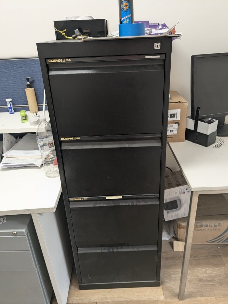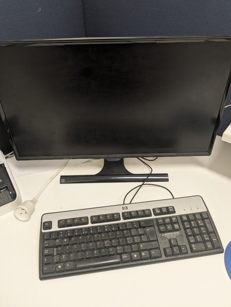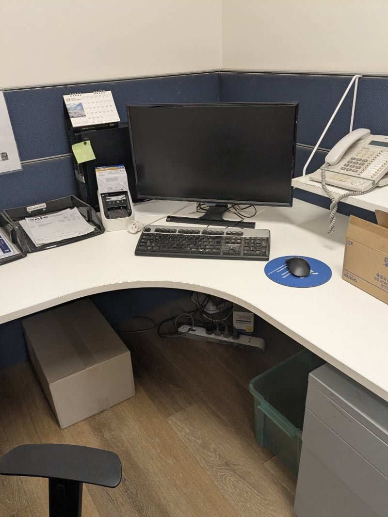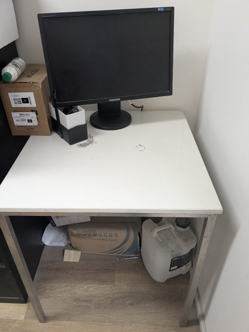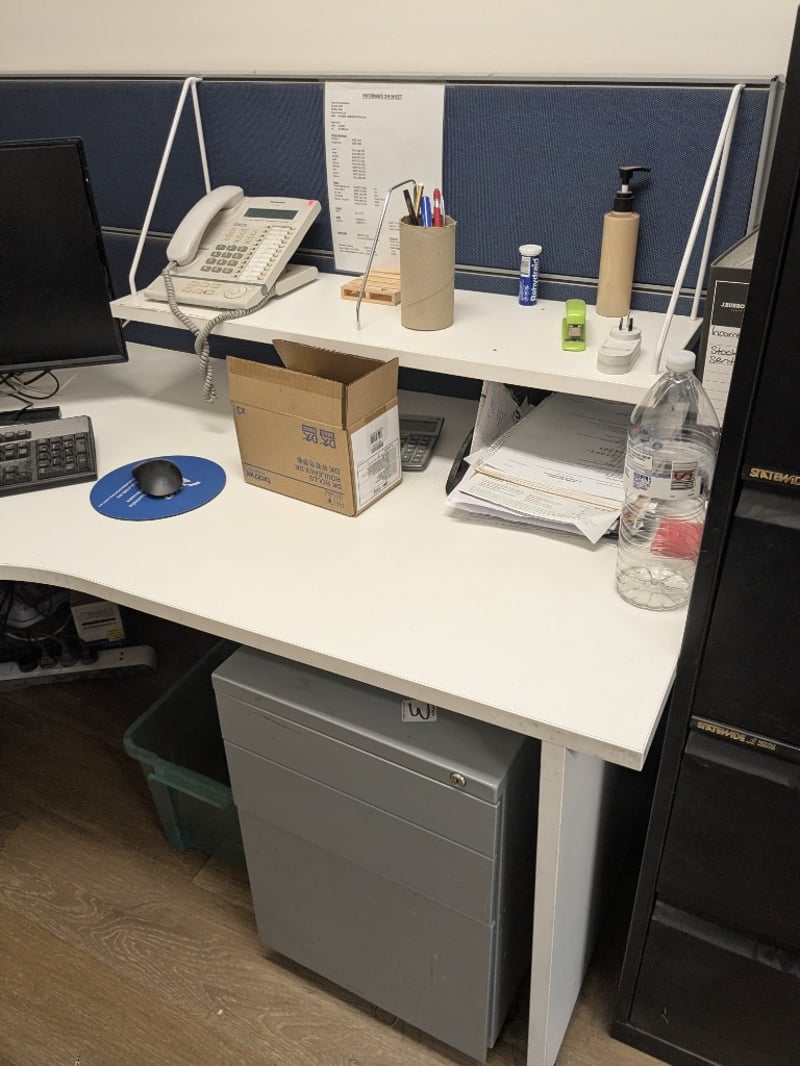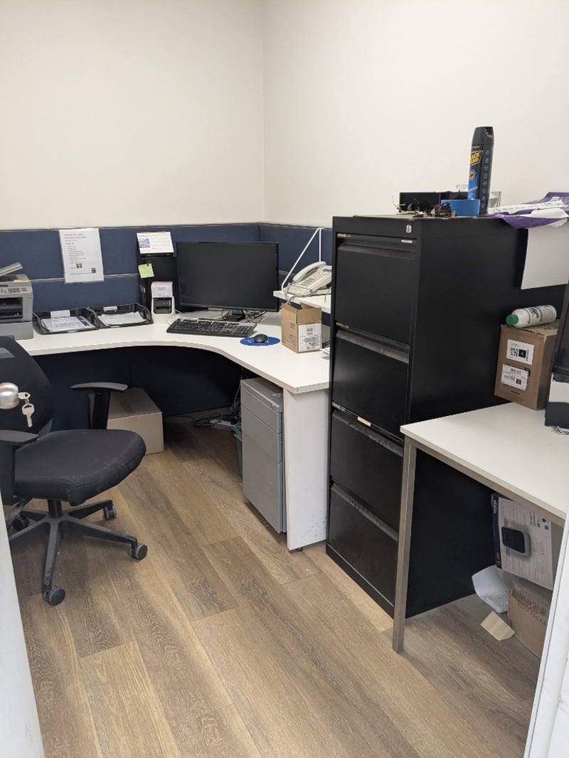 Lot of assorted items including:1. Corner workstation, table, 2x office chairs, pedestal, 4-drawer filing cabinet.2. HP Pro 3000 Core 2 Duo processor, S/N: AUDA0502WP, Samsung S27E390H 27" W-LED monitor, DOM: 02/15, S/N: 0LUUHTNG200070T, HP USB keyboard and HP wireless mouse.3. Brother MFC-7362N, mono, laser, 24ppm, ADF, S/N: E69897M3N398855 and more...Note: Signs of wear and tear, untestedSold as lot.