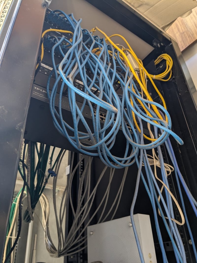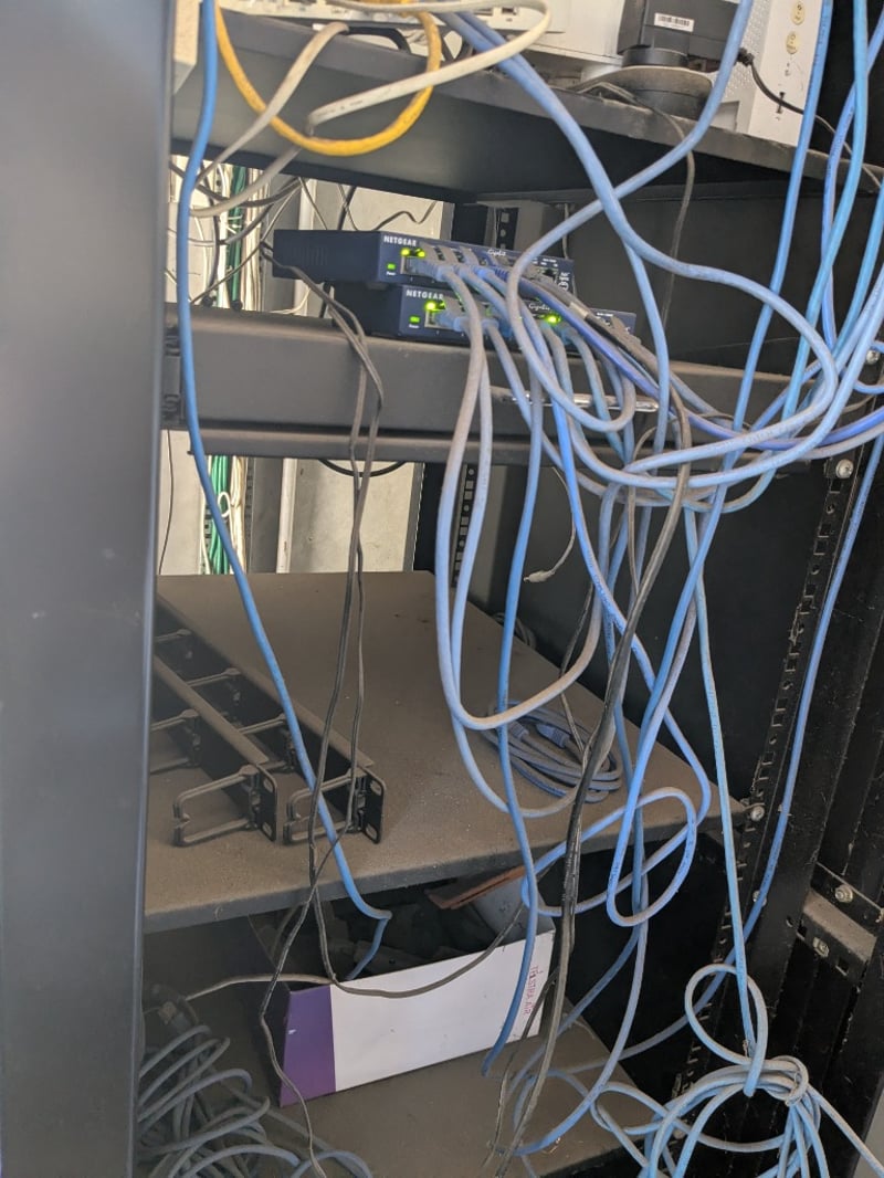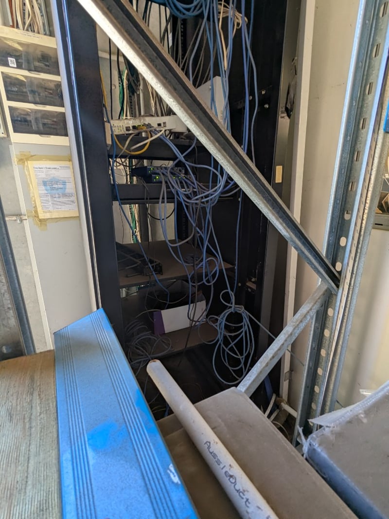 Communications/Network Equipment Rack - Black steel, 42U, installed with 3x 24-port patch panels, TP-Link T1600G-28TS 24-port gigabit smart switch, DrayTek Vigor2862n firewall router and 2x Netgear 8-port gigabit switches and Comprising Panasonic KX-NS700 Smart Hybrid PBX system, 8x Panasonic KX-T7630 handsets, 2x Panasonic KX-T7667 handsets and 1x Panasonic KX-DT33 handset. Note: Signs of wear and tear, untested. Sold as a lot.