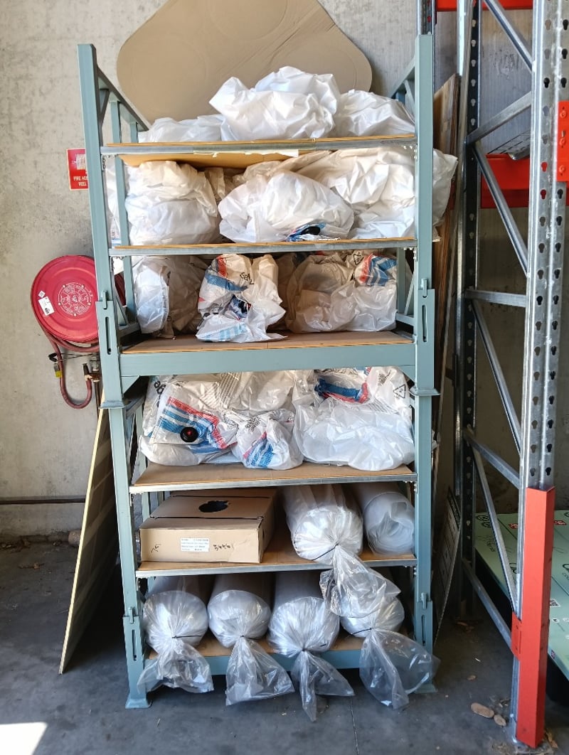 Steel Shelving Stillages - Qty 2xContents include - storage bags, band strap & rolls of thin foamDimensions (HxWxD): 118 X 120 X 150cmSold as lot