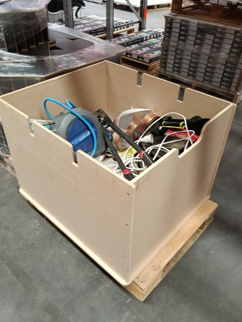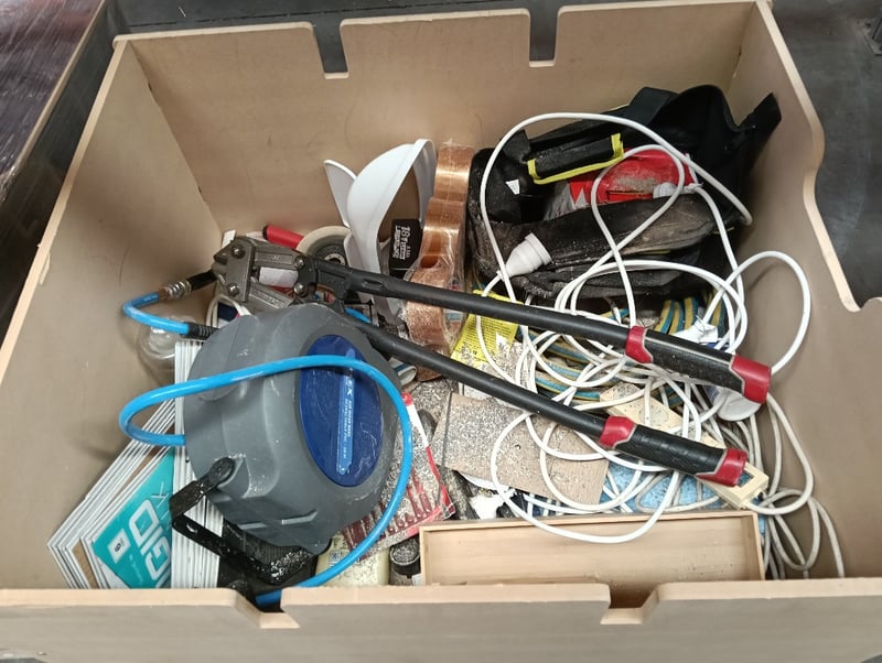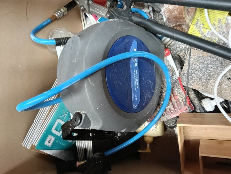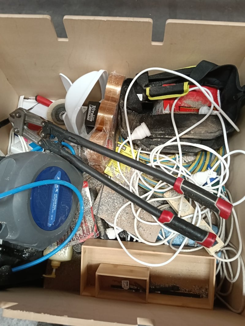 Box of tool essentials - Air hose reel, bolt cutter, extension cord & more