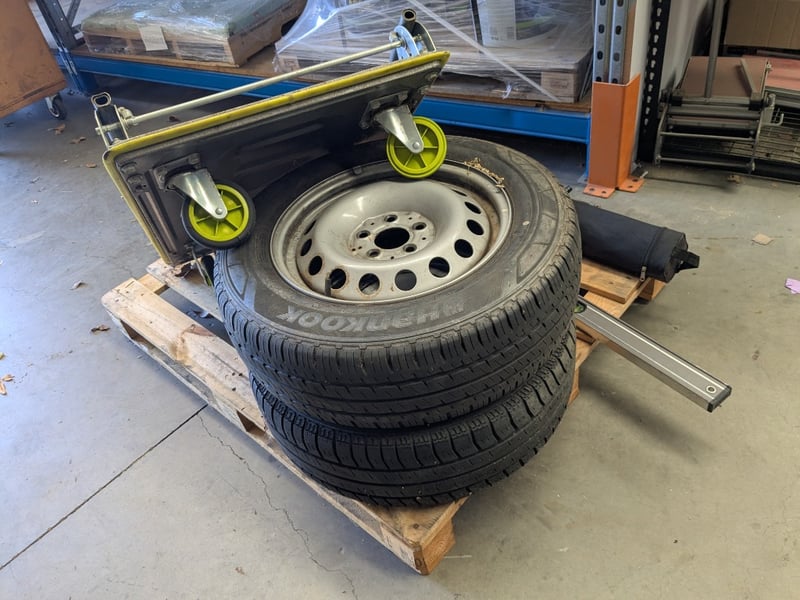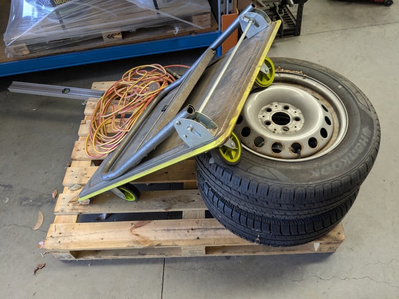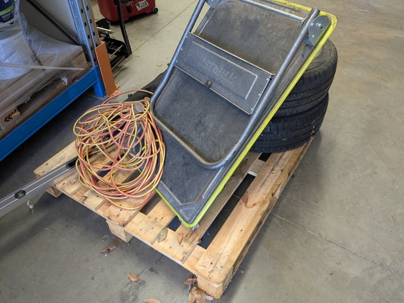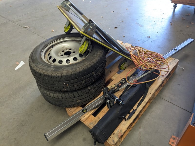 Lot of assorted items including, tires, trolley and more..Note: Signs of wear and tearSold as a lot.