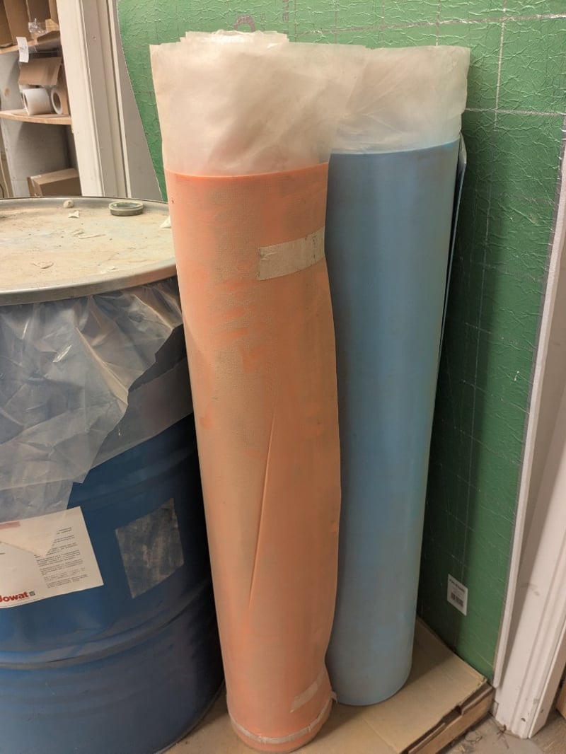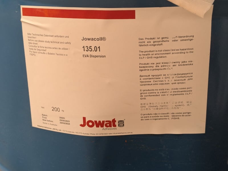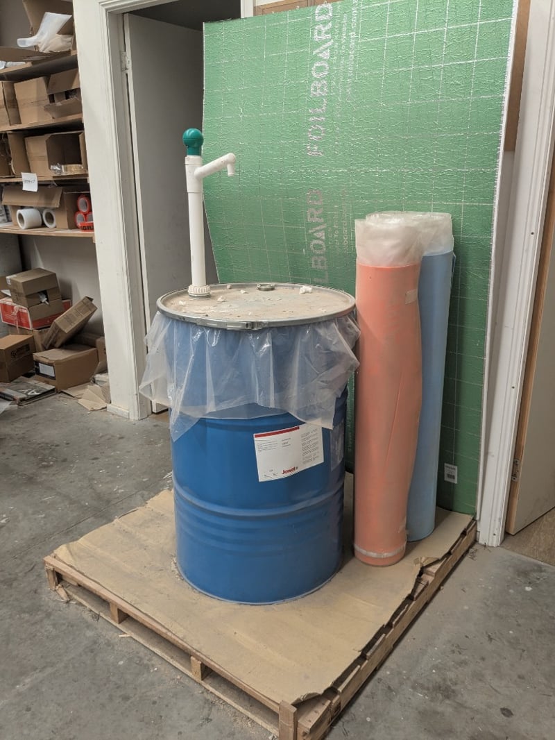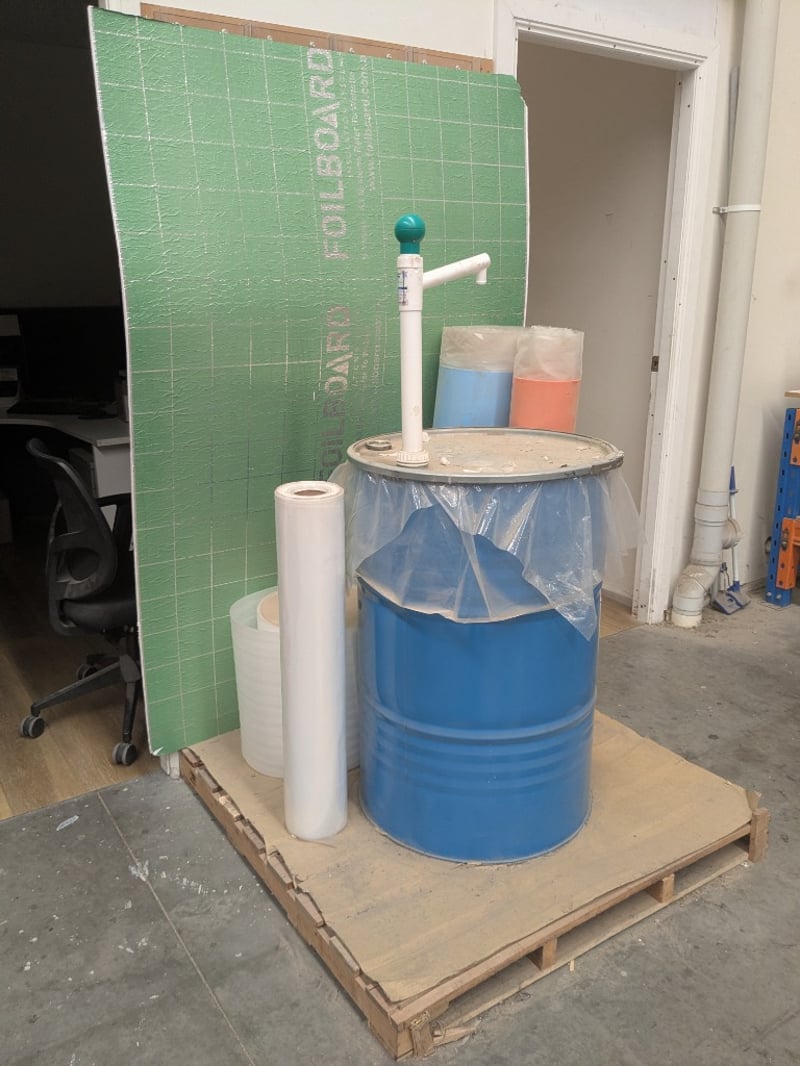 Assorted items including blue industrial barrel fitted with a plastic drum liner and a pump, foil board and more..Note: Signs of wear and tear.Sold as a lot.