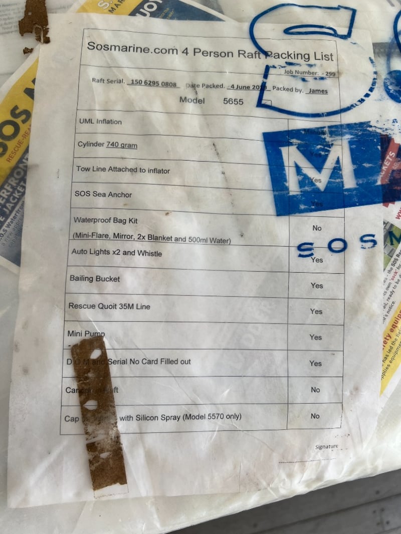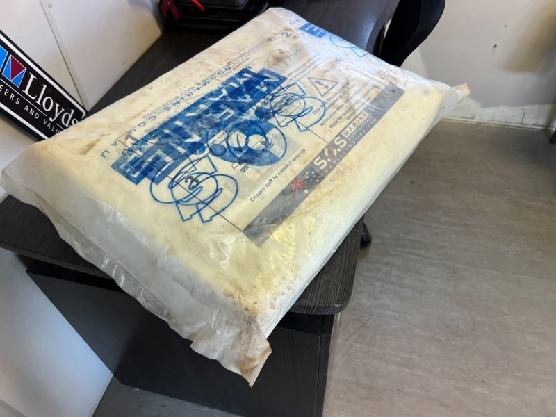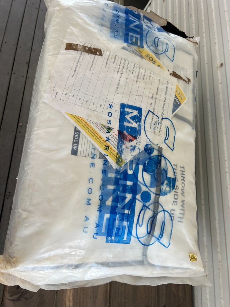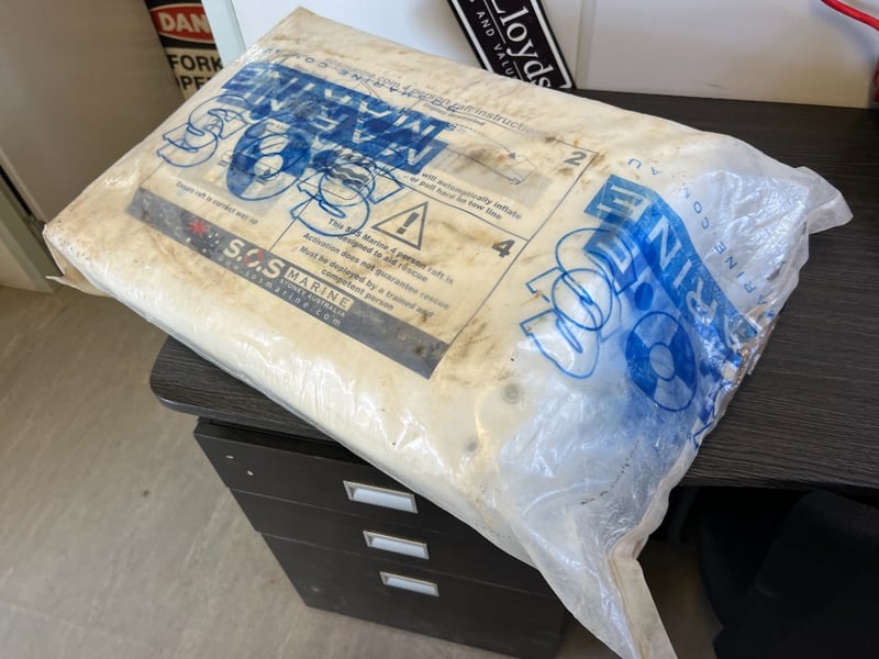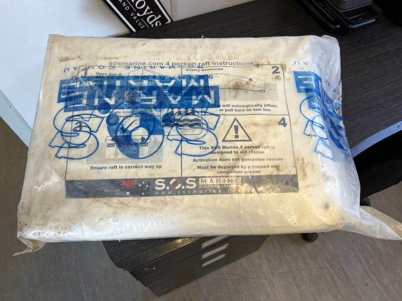 SOS Marine 4 Person Life RaftCompact in size- the raft can be stowed in the smallest of spaces.• Just throw- it automatically inflates- this ultra-light raft can be thrown quickly in an emergency situation it is easier to handle for people of most age groups. (Australia – Manual Inflation Only)• Easy maintenance with much smaller servicing costs.• Thermally insulated floor which is also reflective for search & rescue teams.Features• The SOS 4 person life raft has very stable 3 water pockets• 165 litres of ballast water• Ultra light: weighs only 8.6 kilos (19lbs) in basic fit out• Suitable for all age groups (adults & children) to handle• Compact valise packed – 520 x340x170cm (20”x13”x7”)• Large sea anchor-400mm x 600mm (15”.8 x 23.6 “)• Disposable 740 gram CO2 inflation system• Thermally insulated floor, this simple feature is also reflective for search and rescue• Compact and easy to stow• JUST THROW- it automatically inflates• Incorporates a hand/foot pump• Floating safety knife, bailer, life line and rescue quoit with floating line• Pea-Less whistle• Durable420D nylon fabric PU laminated• Roomy interior 1.4 square metres (15 square feet)SOLAS LIGHTS• 2 SOLAS lights• 150cm (79”) of SOLAS reflective tapeSold as IsLocation: #MACKAYContact Kyle Haywood | Ph 0487 020 888 | [email protected]Holding Yard 3/263 Connors Road, Paget , MACKAY QLD, Australia