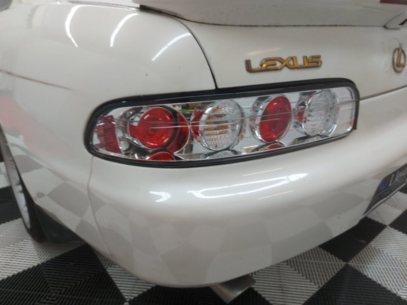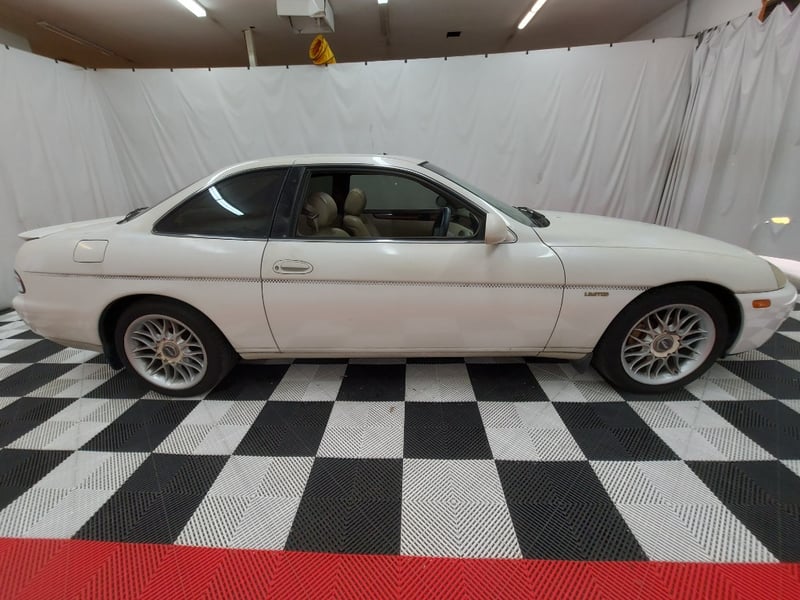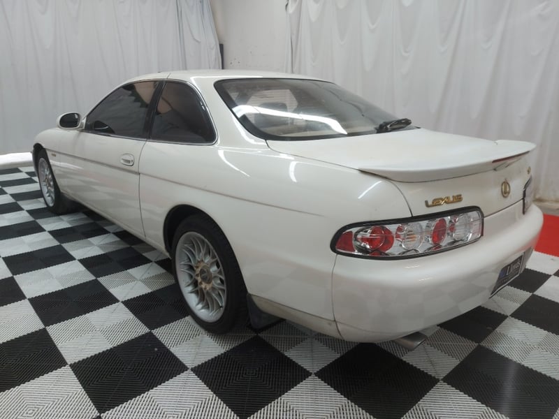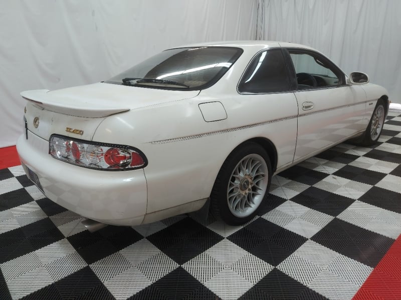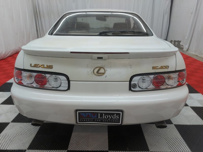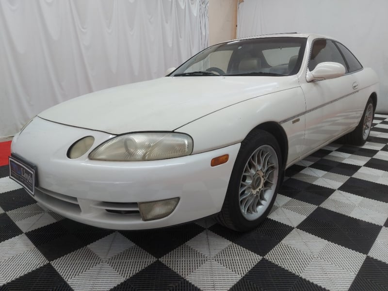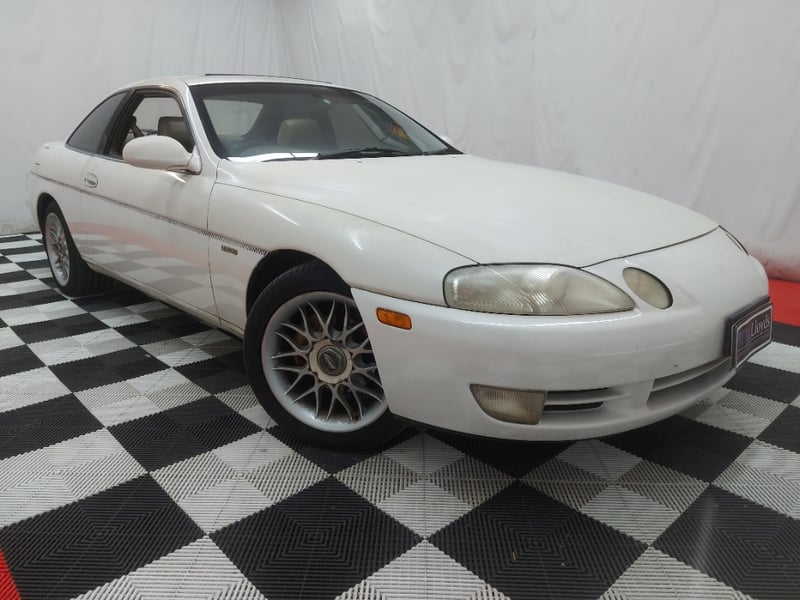 1991 Lexus SC400 two‑door coupe finished in white. Rear‑wheel drive configuration powered by a 4.0‑litre V8 petrol engine paired with an automatic transmission. Odometer indicating 182,216 kilometres.