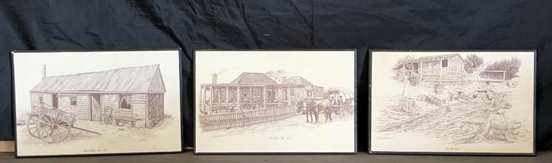 THREE LITHOGRAPH FRAMESItem Size: Height: 29cm, Width: 45cm, Depth: 2cmArtist Unknown, Signed On Each FrameArt Titles Include "Daub & Wattle Miners Hut", "Red Hill Gully", And "The Kings Head Tavern".Condition: Good - Refer To Images585003+20