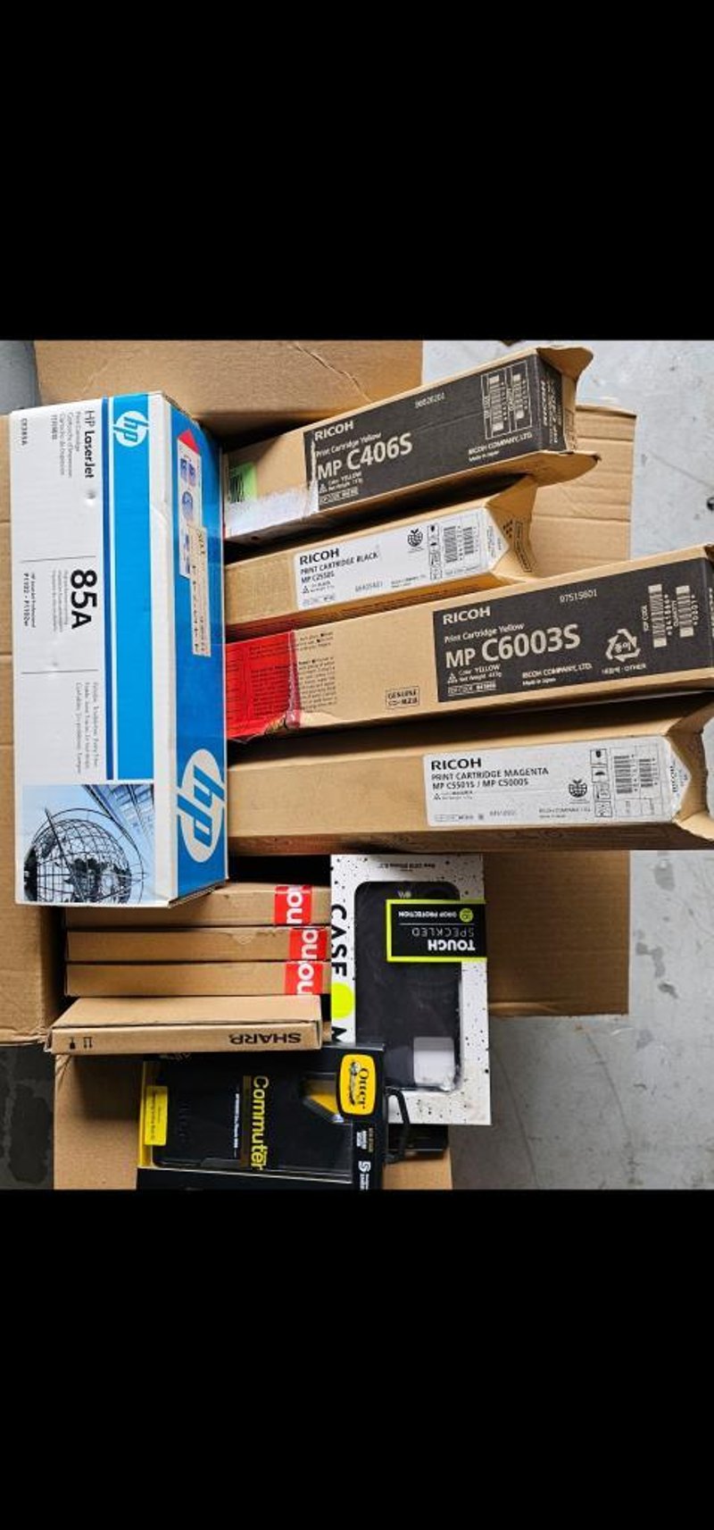 Box of Ricoh HP Ink Cartridges, Phone and Tablet Cases.