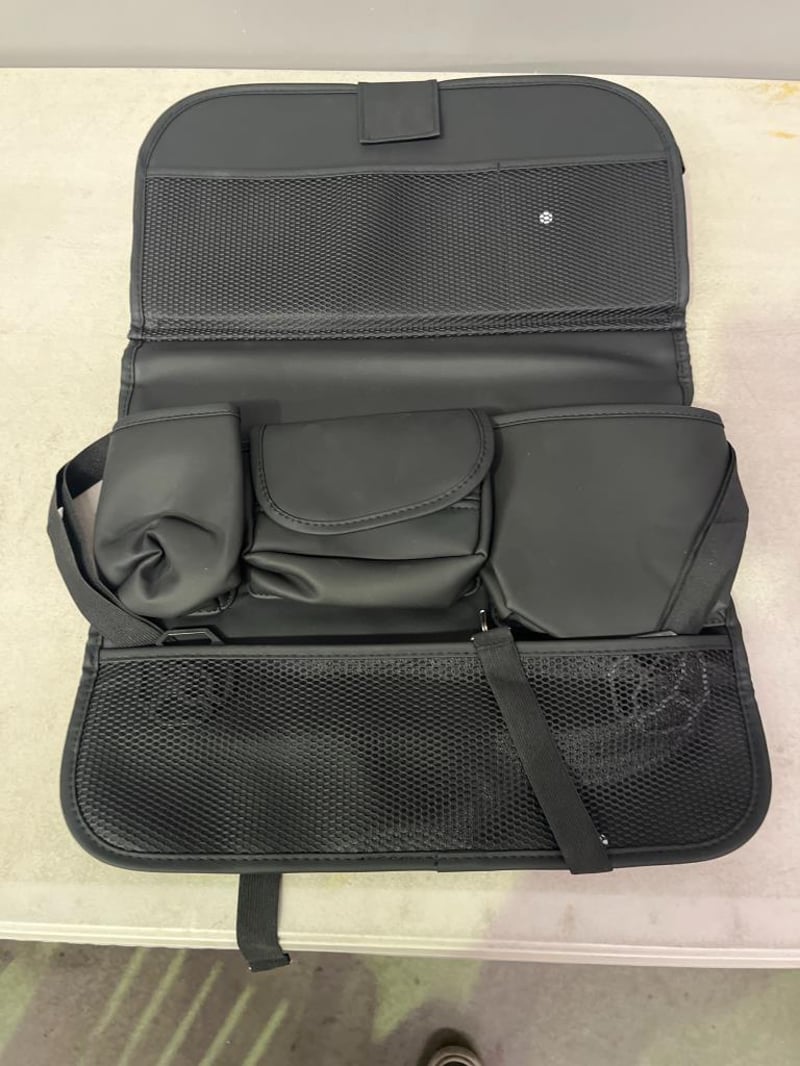 Deranfu Premium PU Leather Backseat Seat Organizer with Foldable Table Multi-Storage Pockets and Adjustable Buckle Strap for Automobiles - Black - REFURBISHED WORKING AS NEW CONDITION