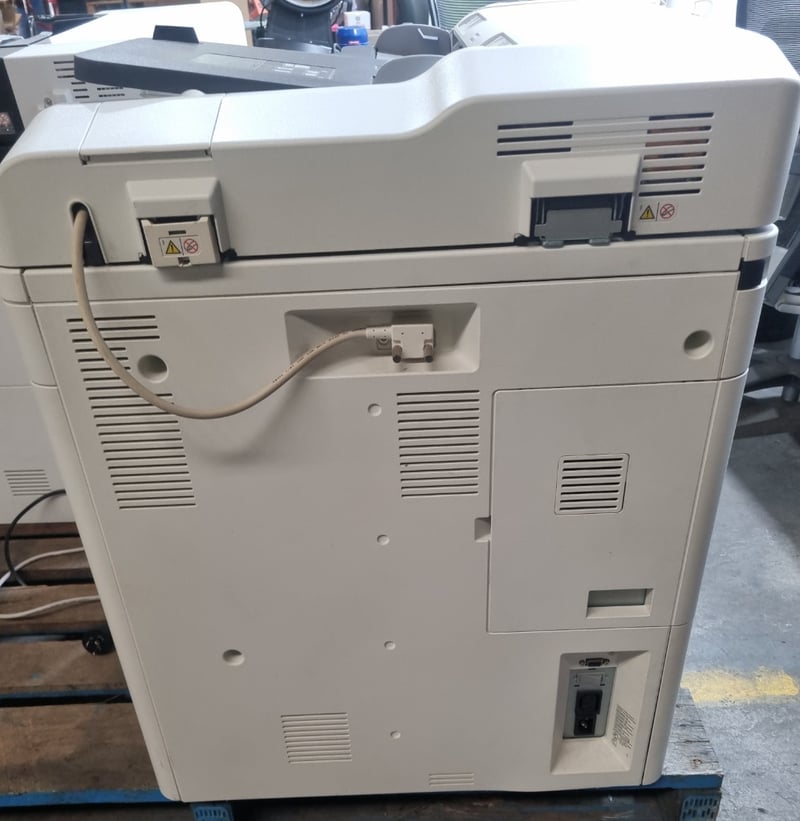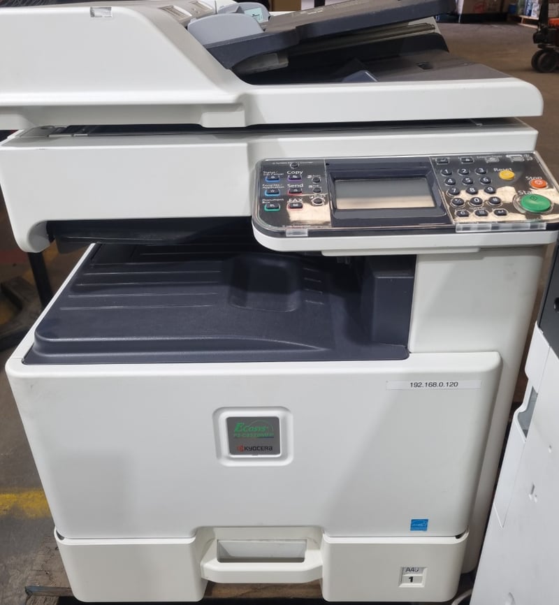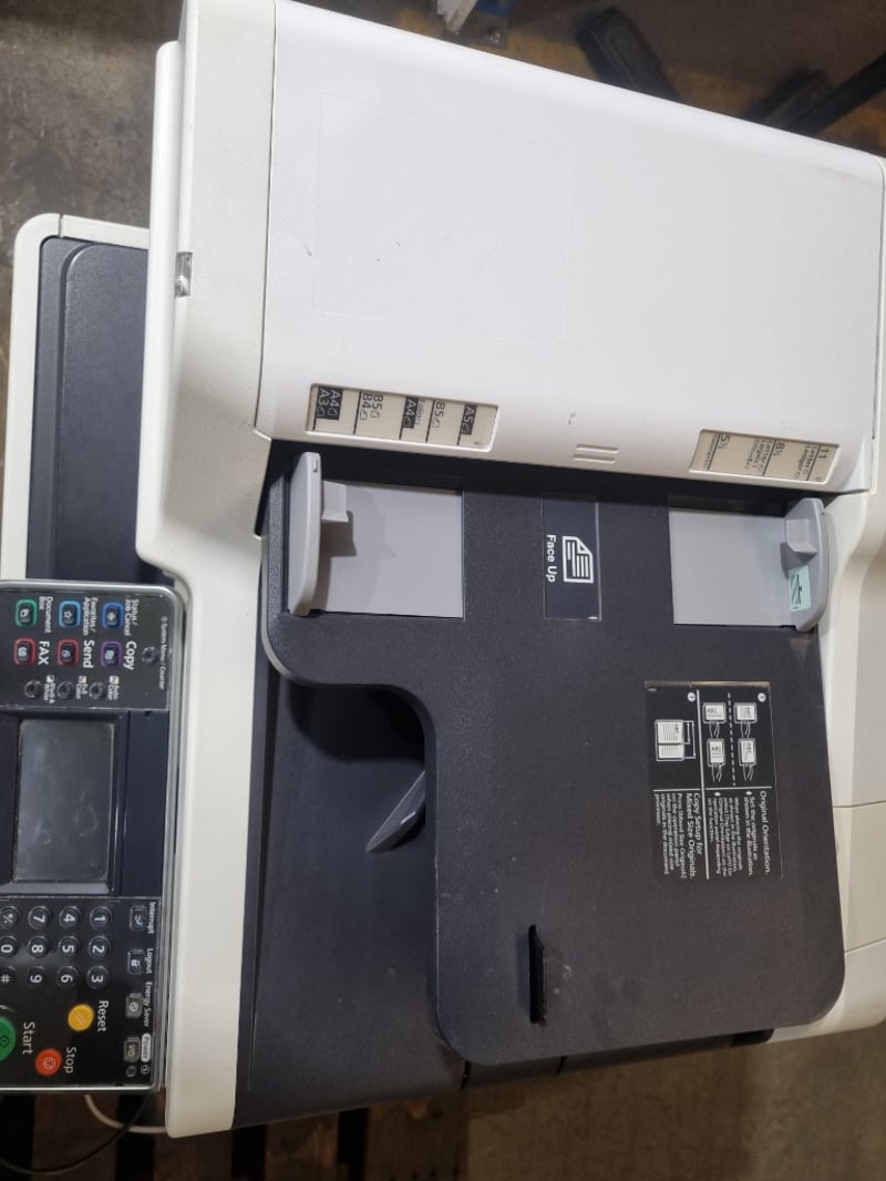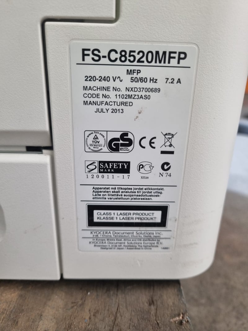 Kyocera FS-C8520MFP multifunction laser printer/copier/scanner manufactured July 2013. White and dark grey colour scheme with integrated document feeder and flatbed scanner. Features touchscreen control panel with numeric keypad, colour buttons (green Start, orange Stop, yellow Reset), and comprehensive function buttons. Network-capable with RS-232 serial and USB connectivity ports visible. Includes automatic document feeder (ADF) for batch processing and large paper tray capacity. Specifications: 220-240V, 50/60Hz, 7.2A power consumption. Machine number NXD3700689, Code 1102MZ3AS0. Class 1 Laser Product certified. Designed for high-volume office environments supporting copy, send, fax and scan functions, professional-grade multifunction system suitable for corporate workgroups.