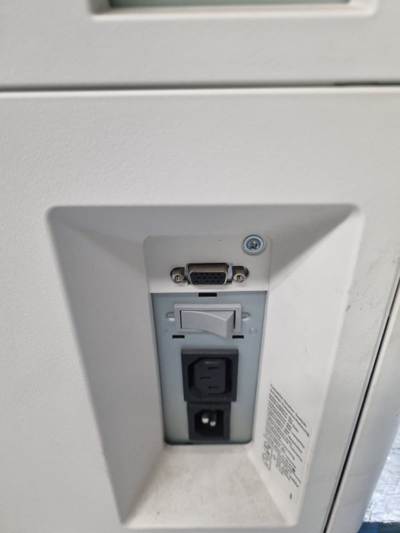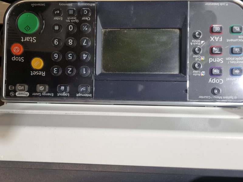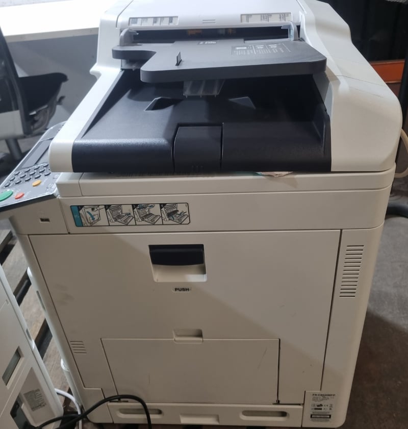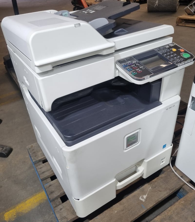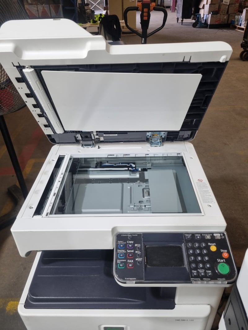 Kyocera FS-C8520MFP multifunction laser printer/copier/scanner manufactured July 2013. White and dark grey colour scheme with integrated document feeder and flatbed scanner. Features touchscreen control panel with numeric keypad, colour buttons (green Start, orange Stop, yellow Reset), and comprehensive function buttons. Network-capable with RS-232 serial and USB connectivity ports visible. Includes automatic document feeder (ADF) for batch processing and large paper tray capacity. Specifications: 220-240V, 50/60Hz, 7.2A power consumption. Machine number NXD3700689, Code 1102MZ3AS0. Class 1 Laser Product certified. Designed for high-volume office environments supporting copy, send, fax and scan functions, professional-grade multifunction system suitable for corporate workgroups.