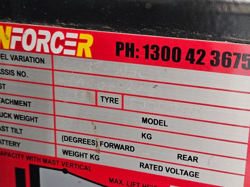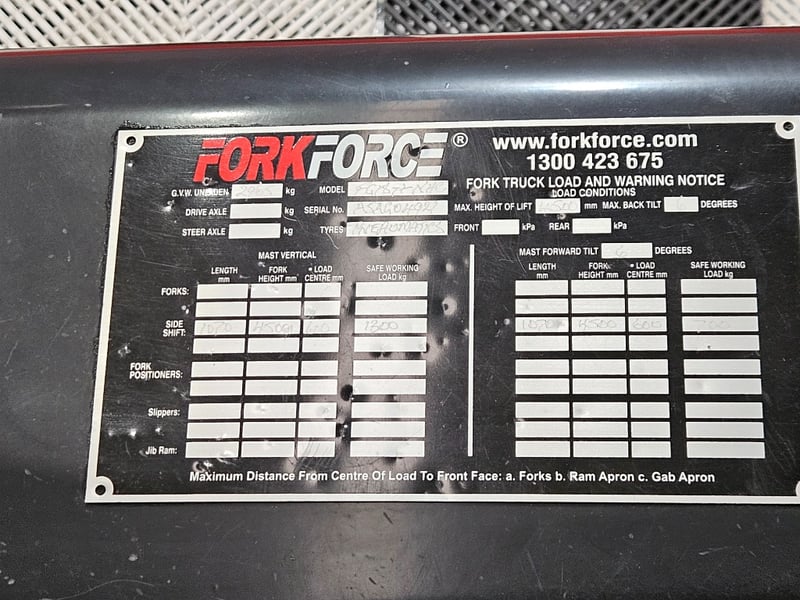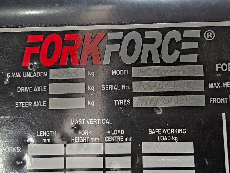 ForkForce FG187XNHC Year: Unknown Make: ForkForce Model: FG187XNHC Colour: Red Configuration: Rubber Tyres Hours: 564.6 hrs Engine: Unknown Engine No.: Unsighted Serial: ASAG04921 Description: Key#: S3