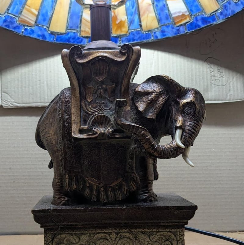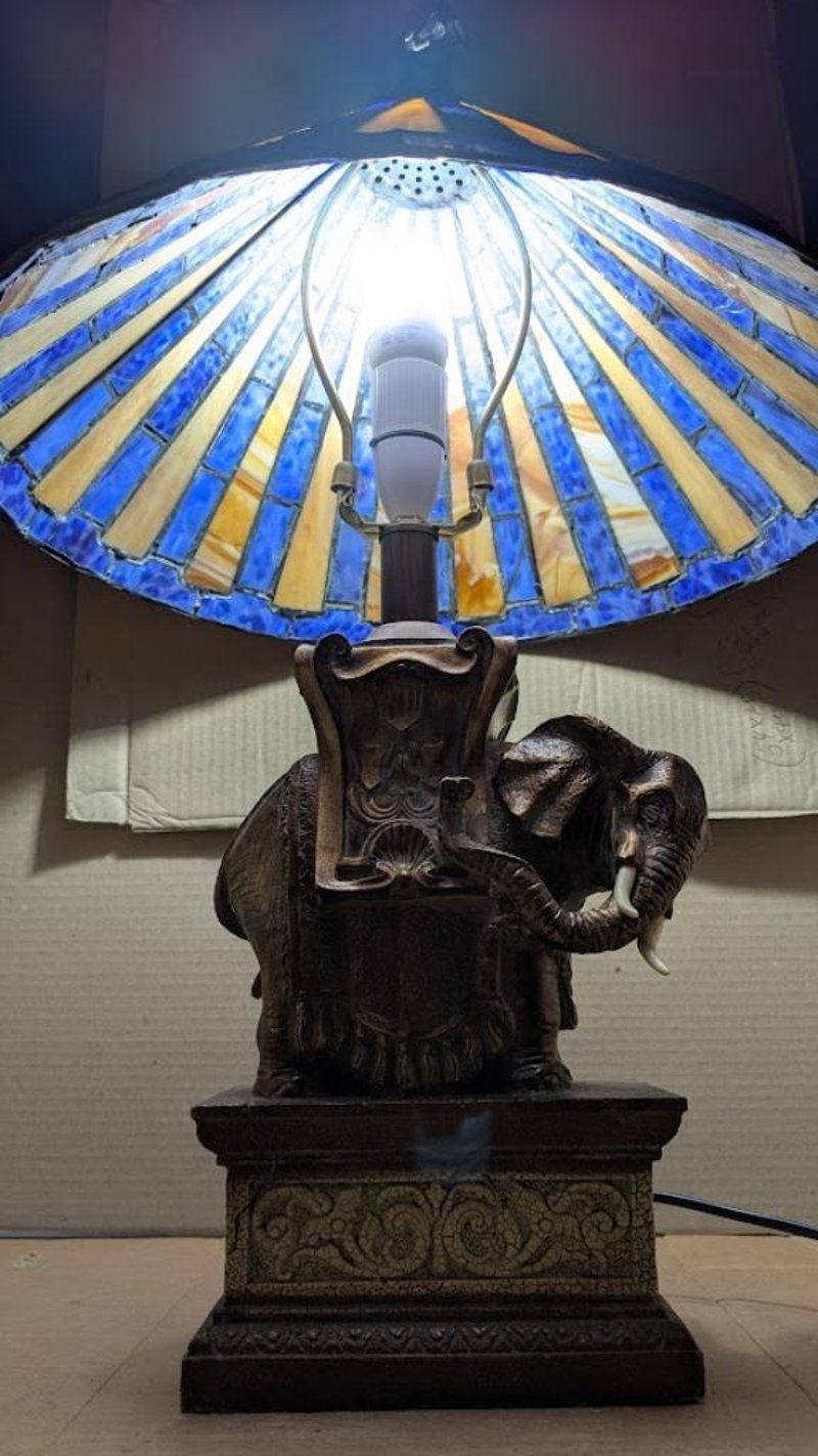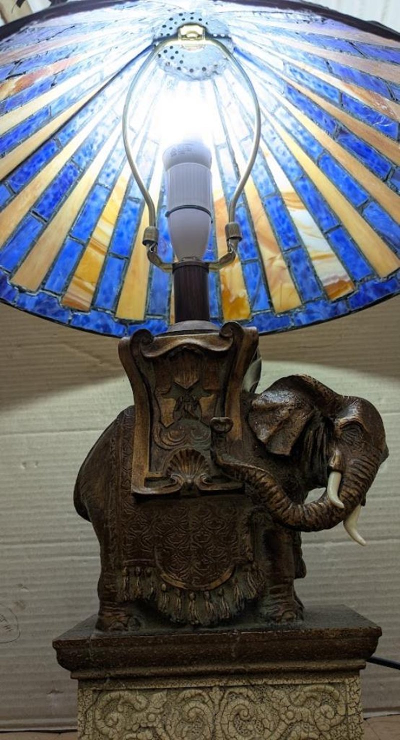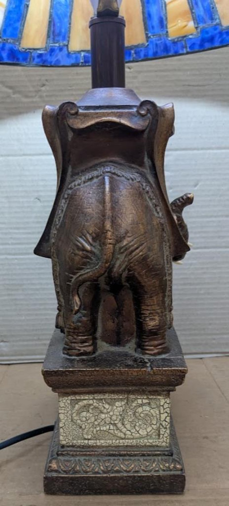 VINTAGE STAINED GLASS LEADLIGHT LAMP, BRONZE COLOR ELEPHANT