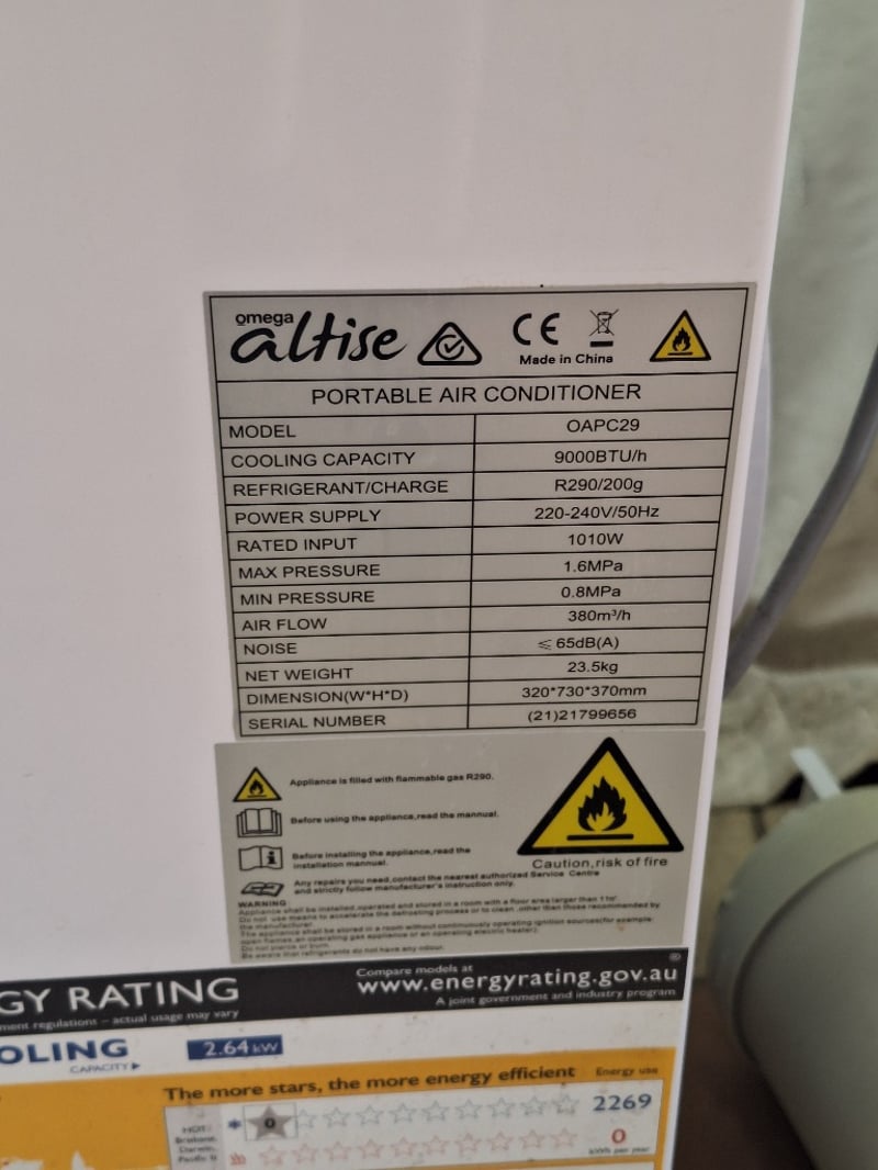Omega Altise OAPC29 Portable Air Conditioner Comes With Remote, White Finish Dimensions H:73cm W:30cm D:34cm