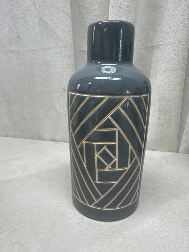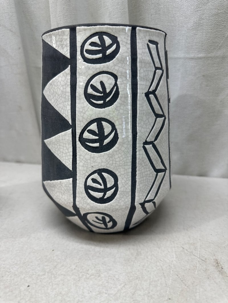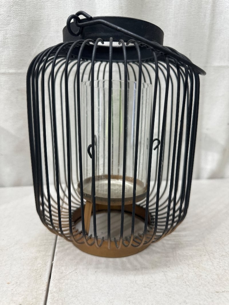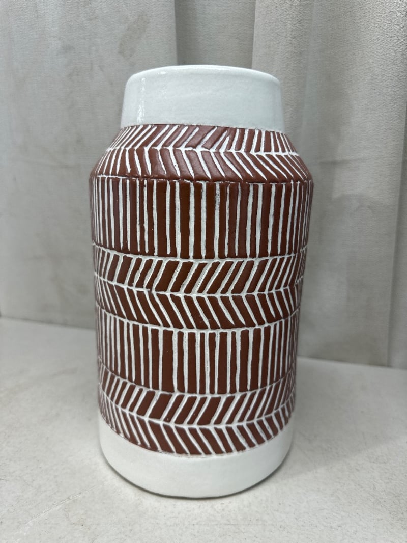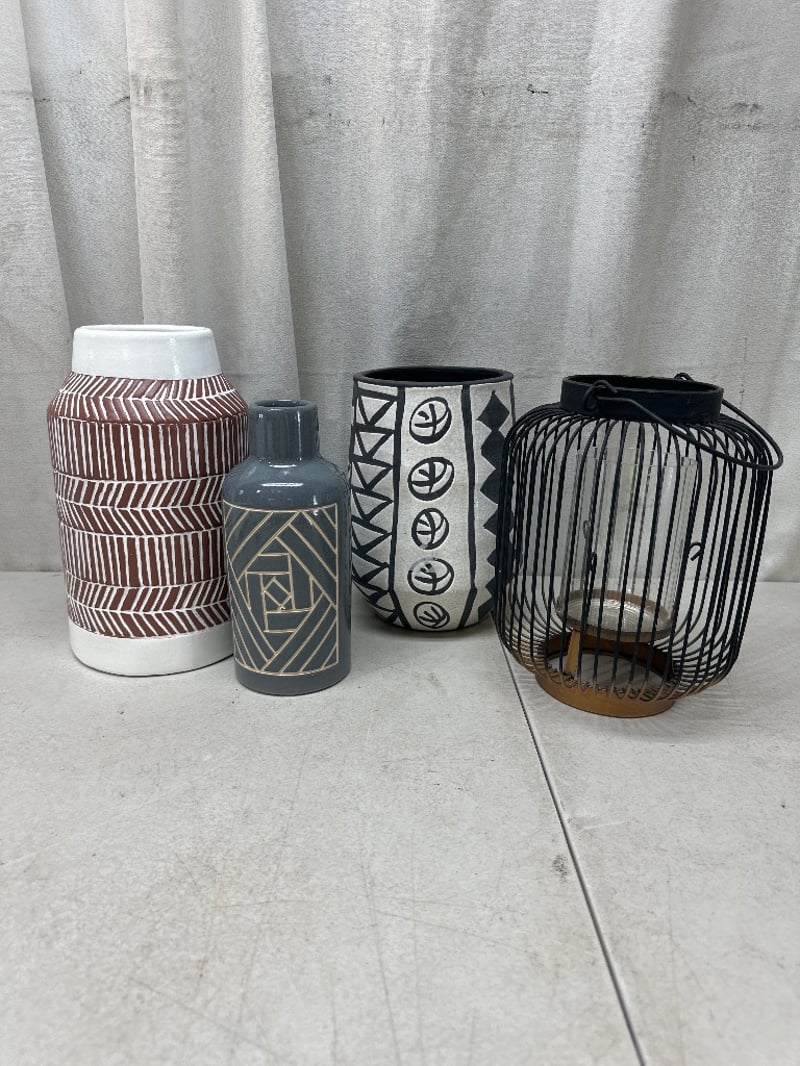 3x vases & 1x lantern 1x Amalfi Habitat vase with brown and white pattern VN36S 1x Naho Ceramic vase with a grey glaze and a geometric pattern. 1x Lima Ceramic vase with a black and white tribal pattern. 1x Black metal cage lantern with a glass hurricane insert. Sold as lot