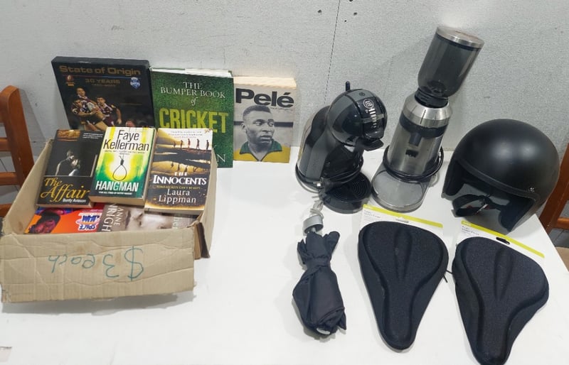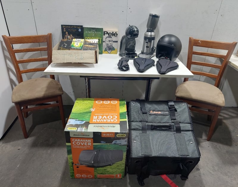 Assorted items including, dining chairs, books, caravan cover and more..Sold as a lot.Note: items are untested, signs of wear.