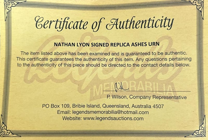 A replica ashes urn personally signed by Nathan Lyon. Nathan Lyon is an Australian international cricketer. Lyon made his Test debut in 2011 and plays domestic cricket for New South Wales. The item is accompanied by a certificate of authenticity.