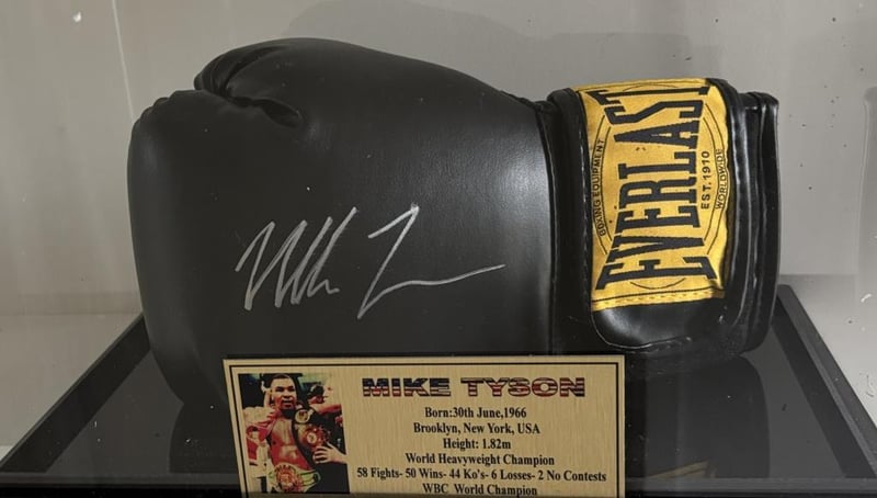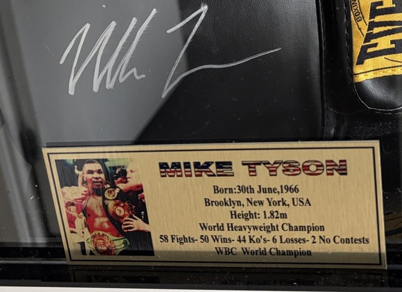 Mike Tyson Personally Signed Everlast Boxing Glove. The Glove Is 12 Oz. The Glove Is Presented In An Acrylic Display Case With Gold Statistics Plaque. The Item Is Accompanied By A Certificate Of Authenticity.