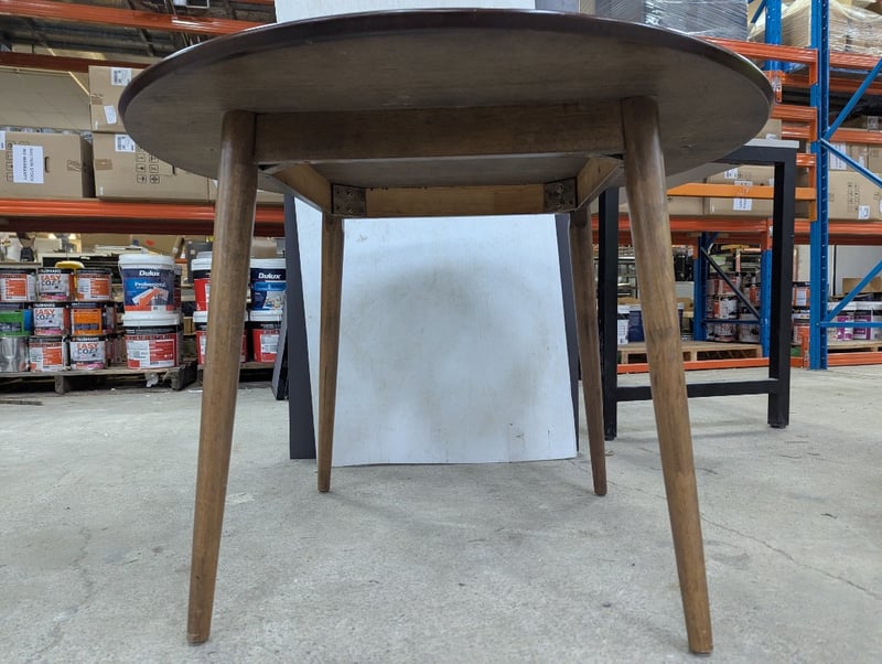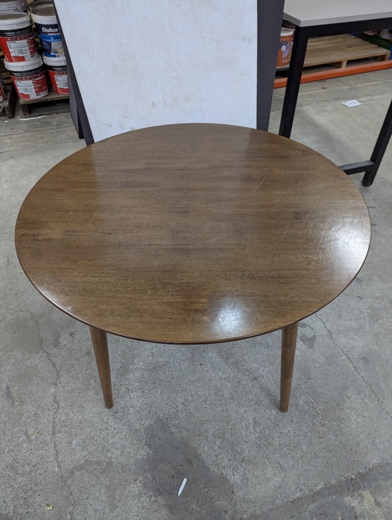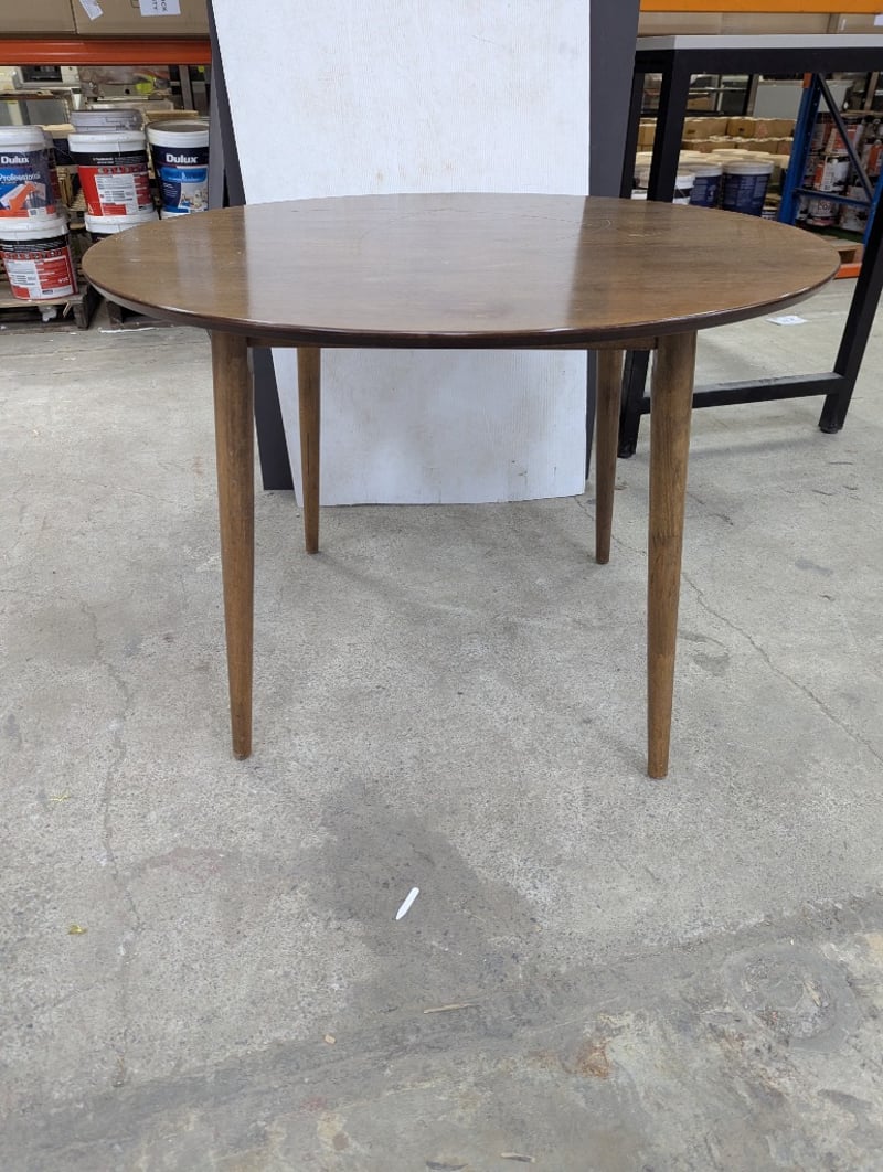 Dining table, round timber top and legs Dimensions: H 75cm x W 107cm x D 107cm