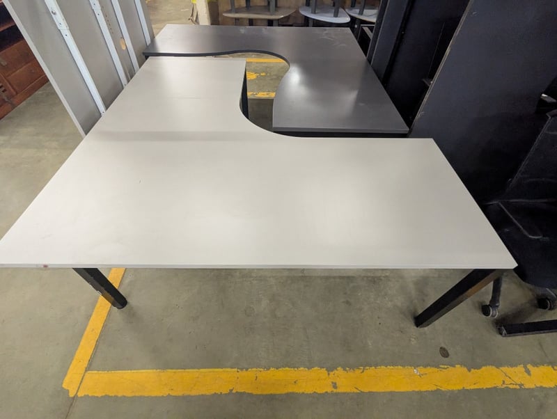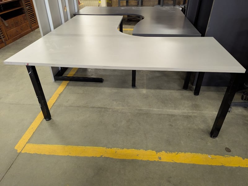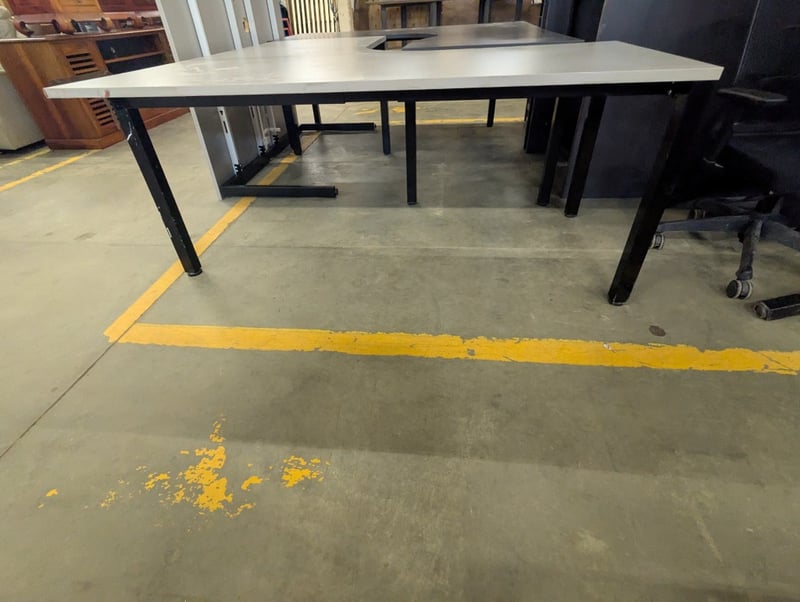 Corner desk, light grey timber top, black metal frameDimensions: H 74cm x W 180cm x 180cm