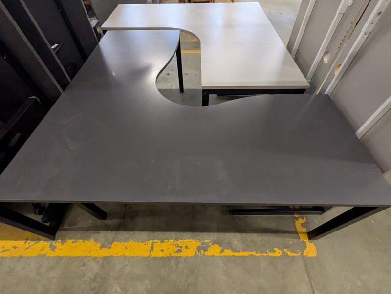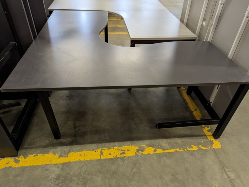 Corner desk, dark grey timber top, black metal frame