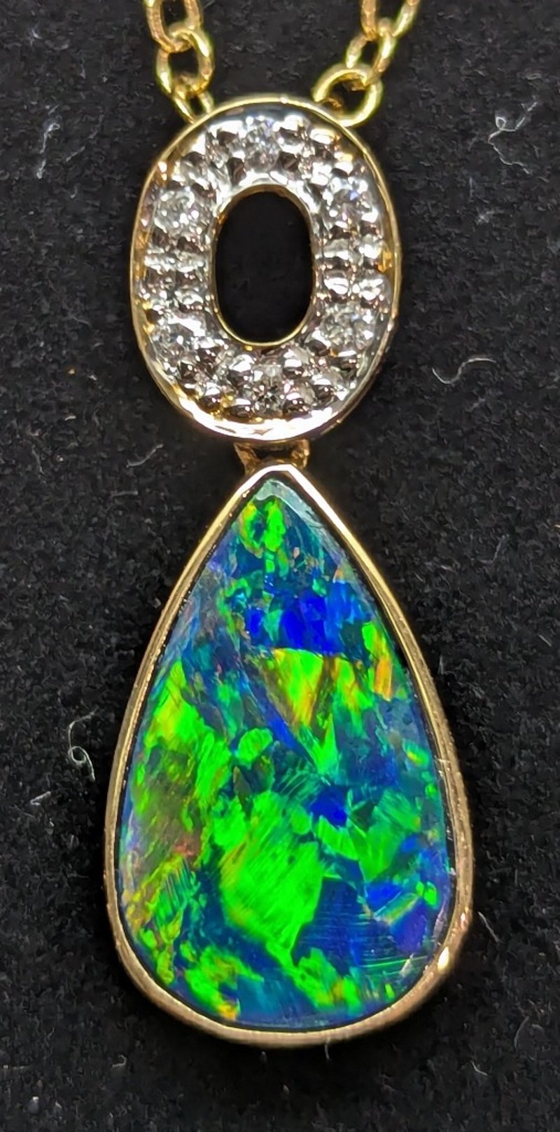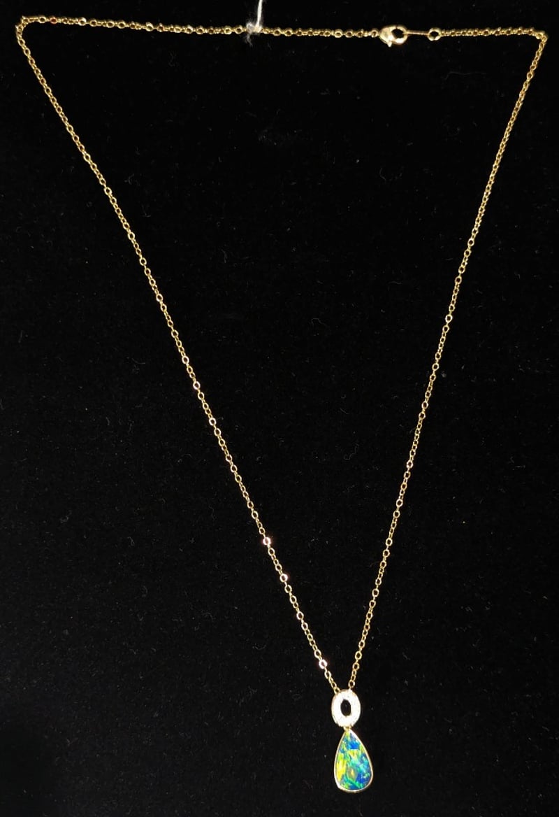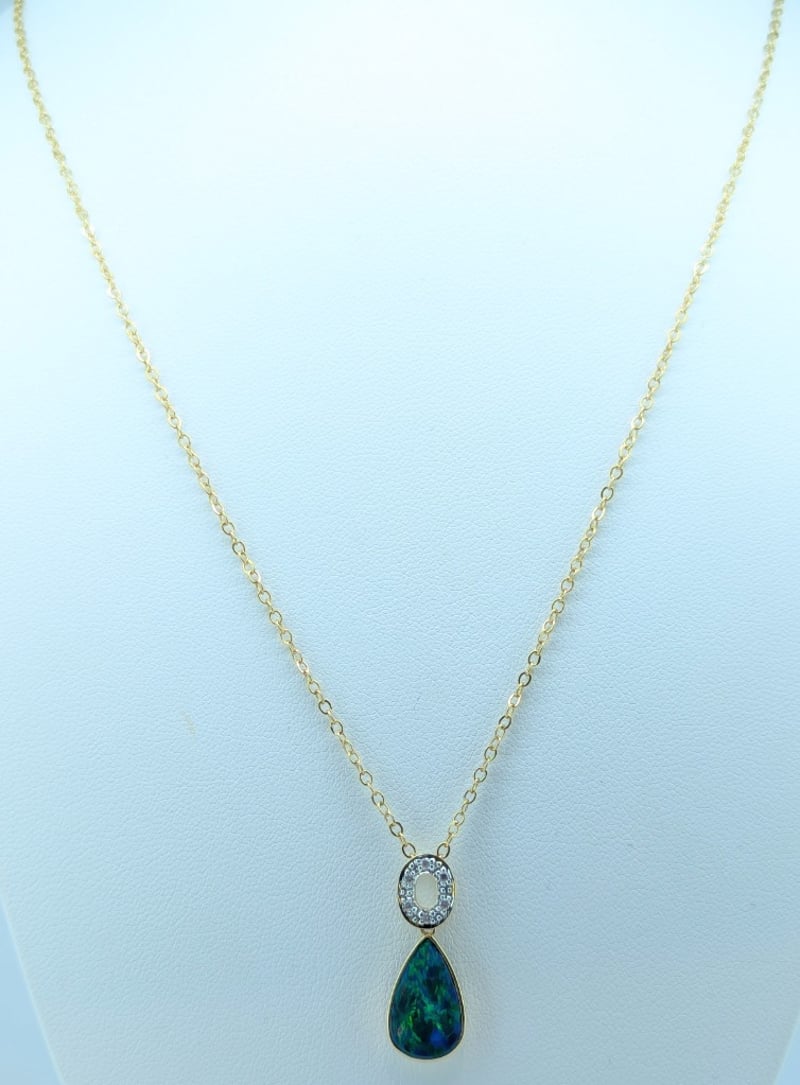 14K YELLOW GOLD OPAL AND DIAMOND PENDANT NECKLACEPendant Features Opal Doublet In Pear Setting,Ring Of Six Round Cut Diamonds Set Above Opal, Total Diamond Weight: 0.06Ct,Pendant Size Approx: 2.5Cm X 1.2Cm,Yellow Gold Plated Chain, Chain Length Approx: 50Cm (Unclasped)Total Item Weight: 3.20gMarkings: Stamped: 14K / 585Condition: Good - Refer To Images586318+13