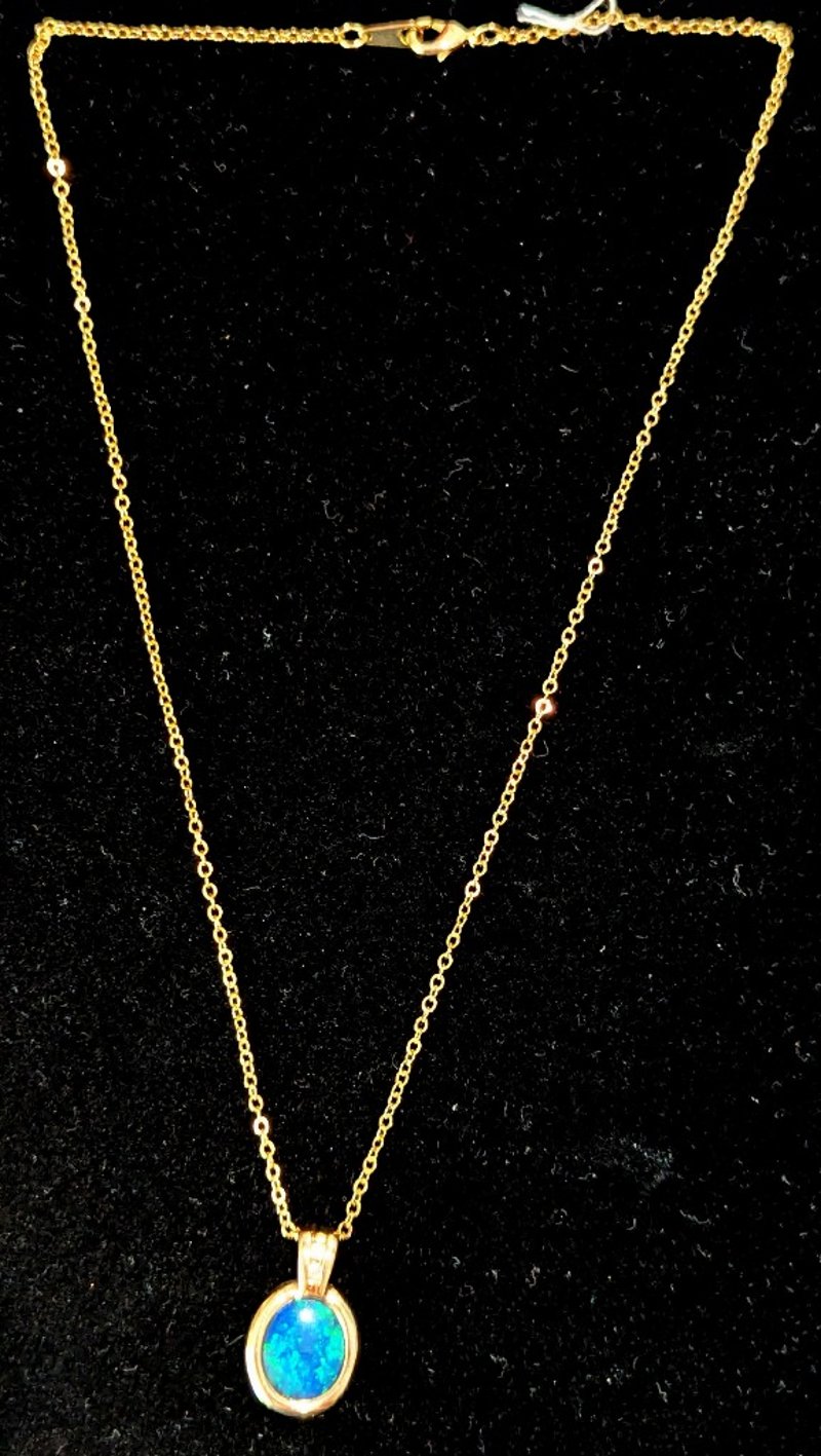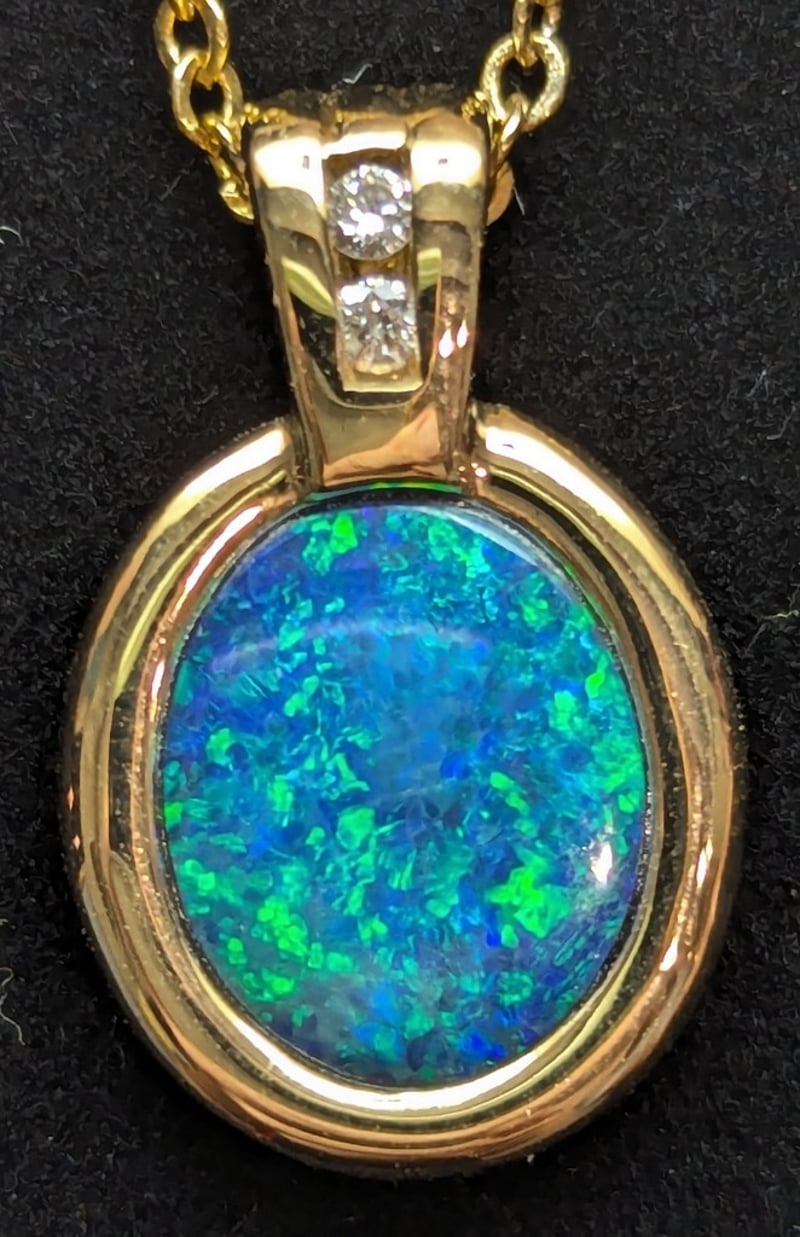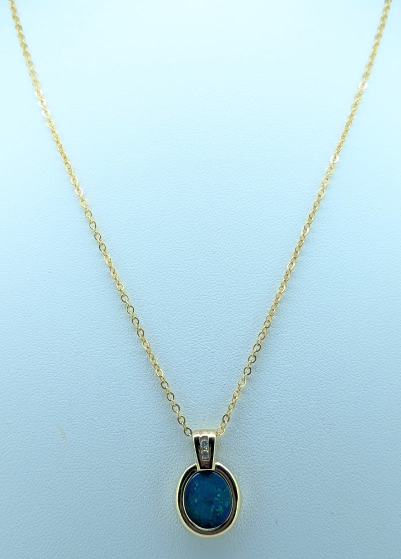 14K YELLOW GOLD OPAL AND DIAMOND PENDANT NECKLACE Pendant Features 2.12Ct Opal Doublet, Two Round Cut Diamonds Chanel Set In Line Above Opal, Total Diamond Weight: 0.05Ct, Pendant Size Approx: 2.3Cm X 1.5Cm, Yellow Gold Plated Chain, Chain Length Approx: 40Cm (Unclasped) Total Item Weight: 4.48g Markings: Stamped: 14K / 585 Condition: Good - Refer To Images 586318+14