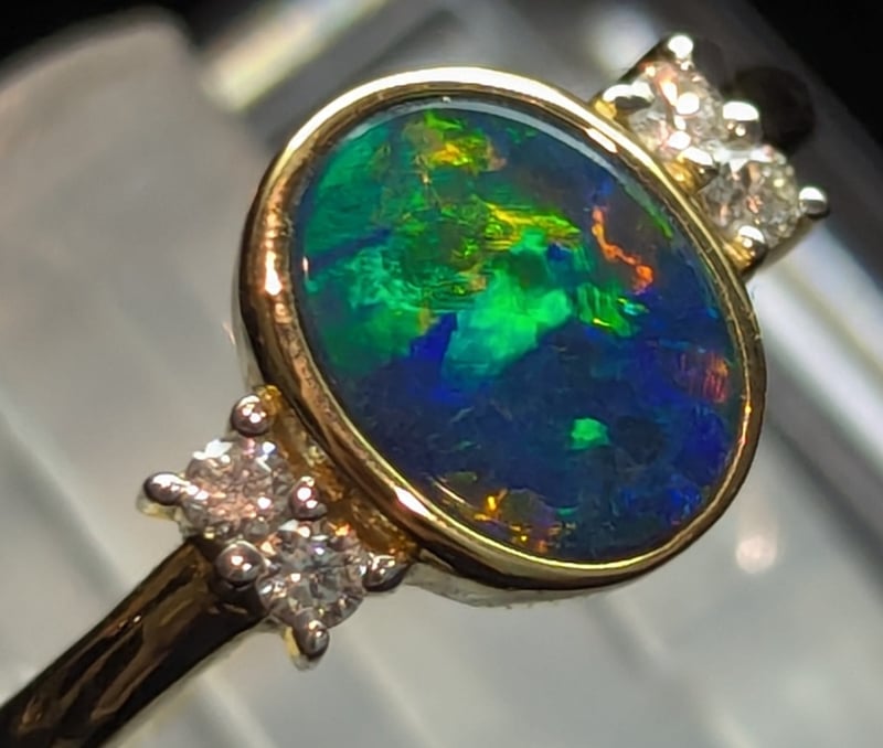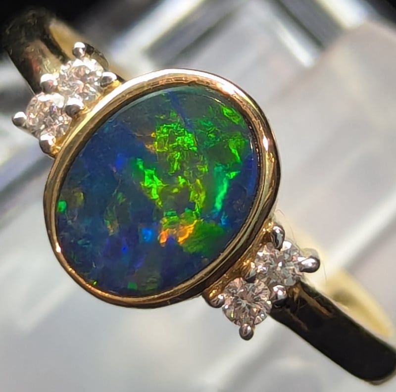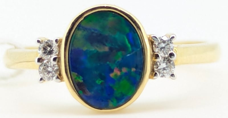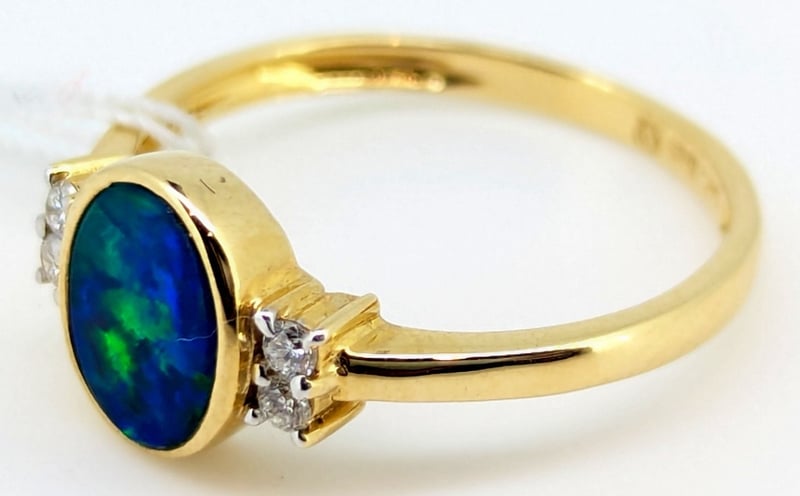 14K YELLOW GOLD OPAL AND DIAMOND RINGRing Features Centre Set 0.48Ct Opal Doublet,Four Round Cut Diamonds In Ring Four Claw Should Settings, Total Diamond Weight: 0.08CtRing Size: N 1/2Total Item Weight: 1.97gMarkings: Stamped: 14K / 585Condition: Good - Refer To Images586318+33