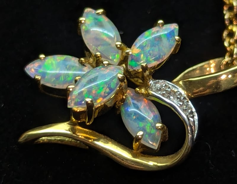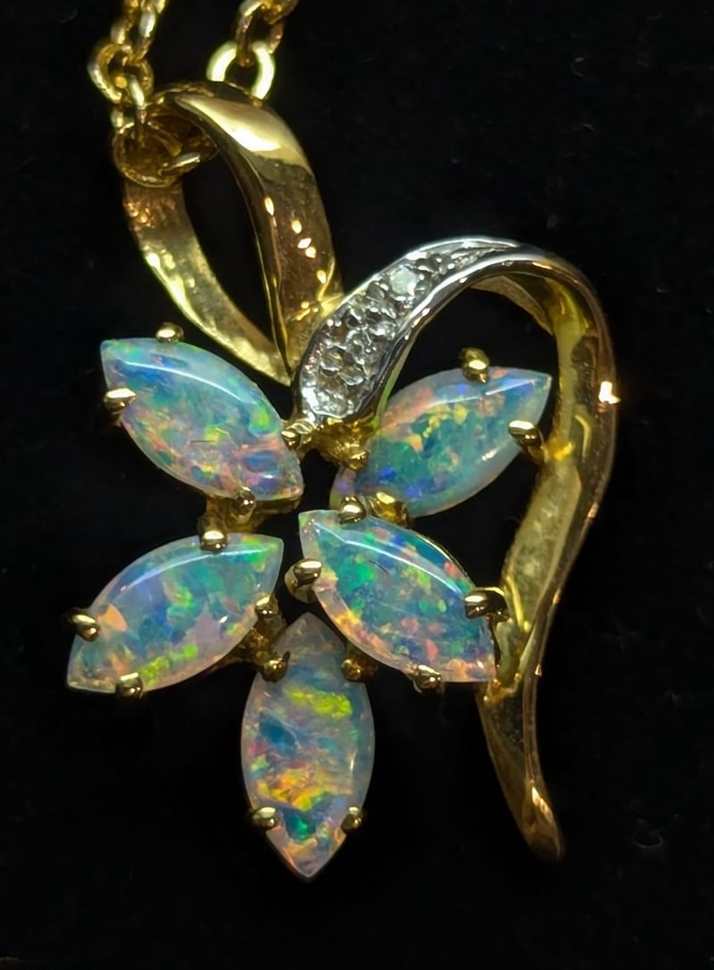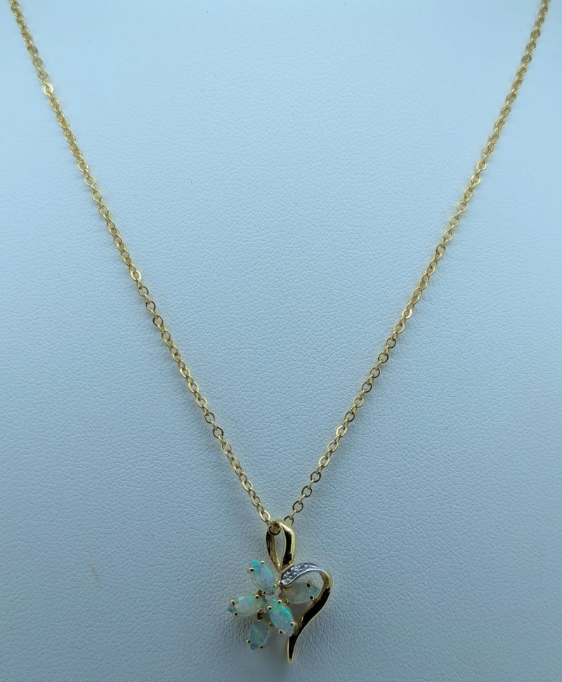 18K YELLOW GOLD WHITE OPAL AND DIAMOND FLOWER PENDANT NECKLACE