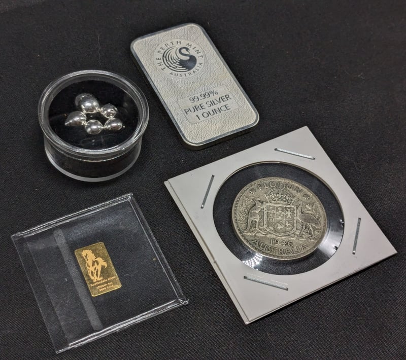4.14 GRAMS SILVER NIBS, THE PERTH MINT 99.99% PURE SILVER BAR, 1946 AUSTRALIAN FLORIN COIN, SCOTTSDALE MINT .9999 GOLD584406+8