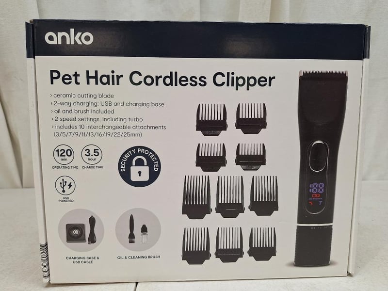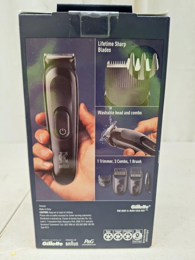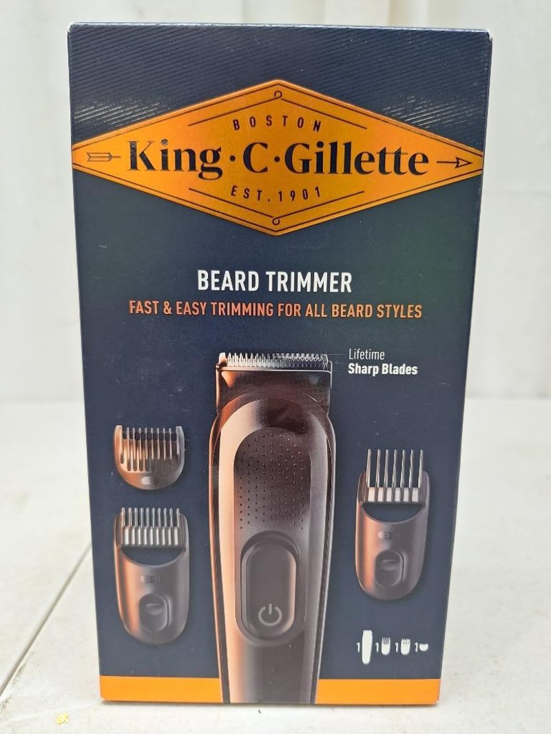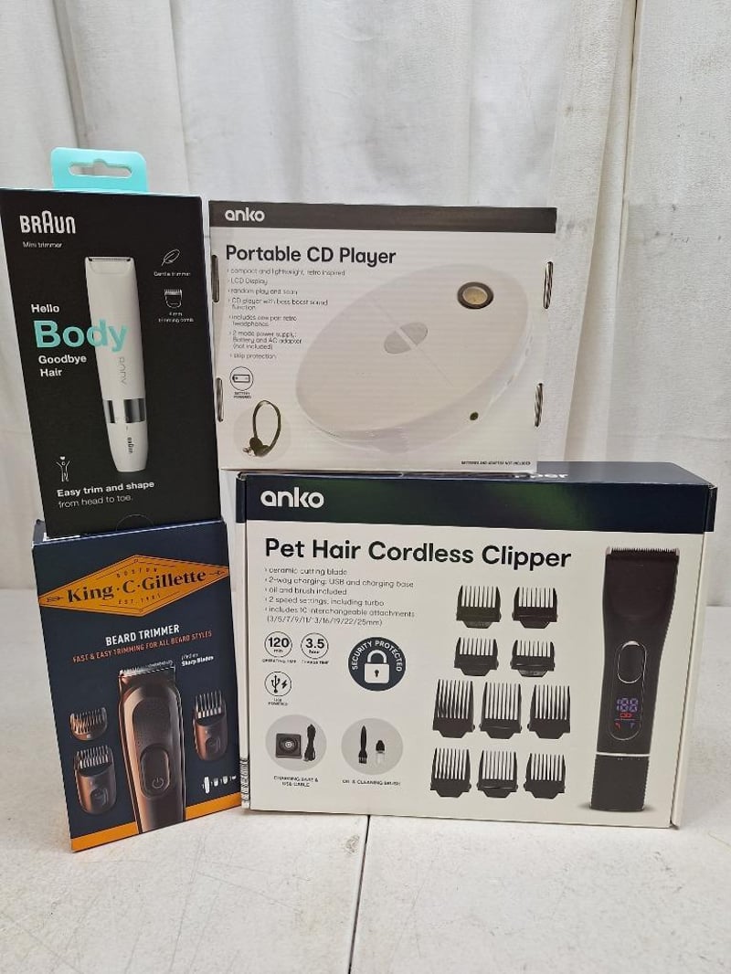 1x KING C GILETTE beard trimmer, for all beard styles, lifetime sharp blades, factory sealed in box, 1x BRAUN mini trimmer, waterproof, factory sealed in box, 1x ANKO portable CD player, battery powered, with headset, factory sealed in box, 1x ANKO pet hair cordless clipper, charging base and cable, factory sealed in box