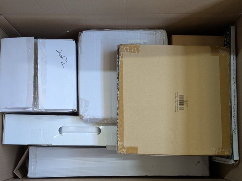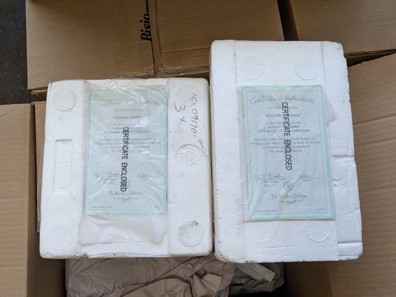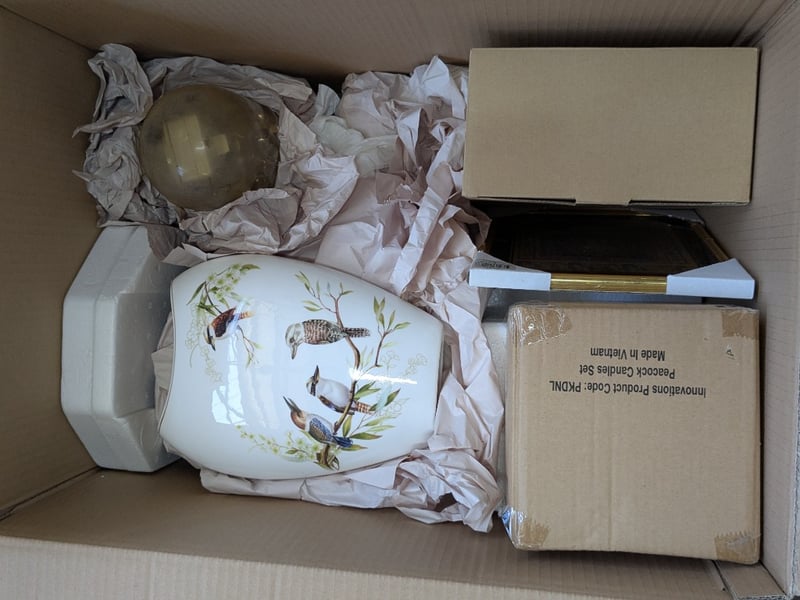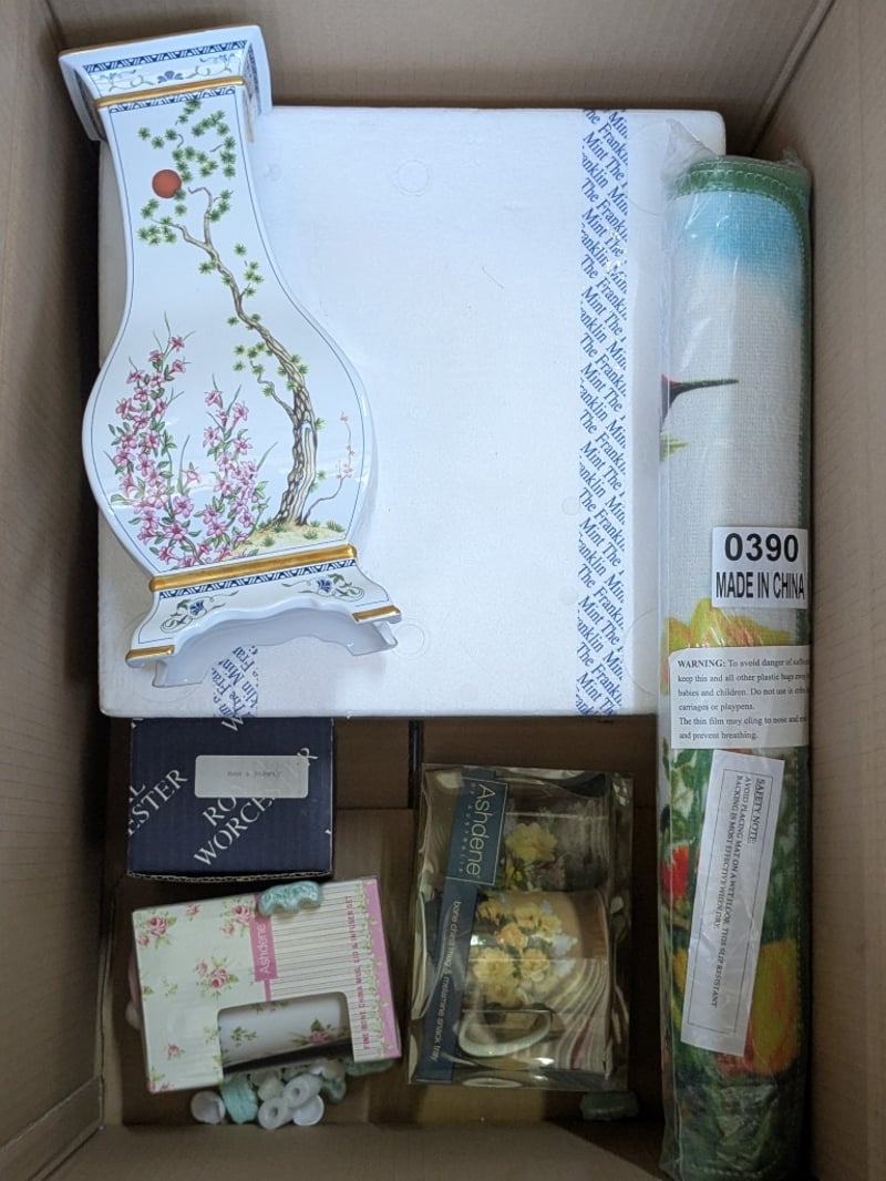 Homewares, 9 boxes including Franklin Mink decorative plates, kitchenware, ornaments and more
