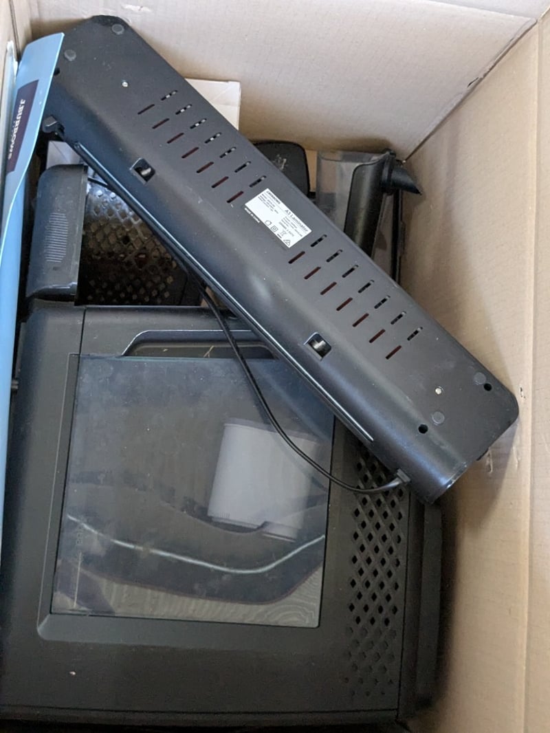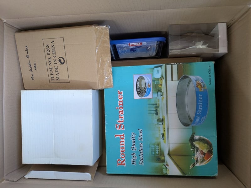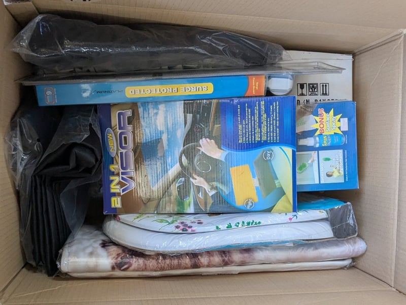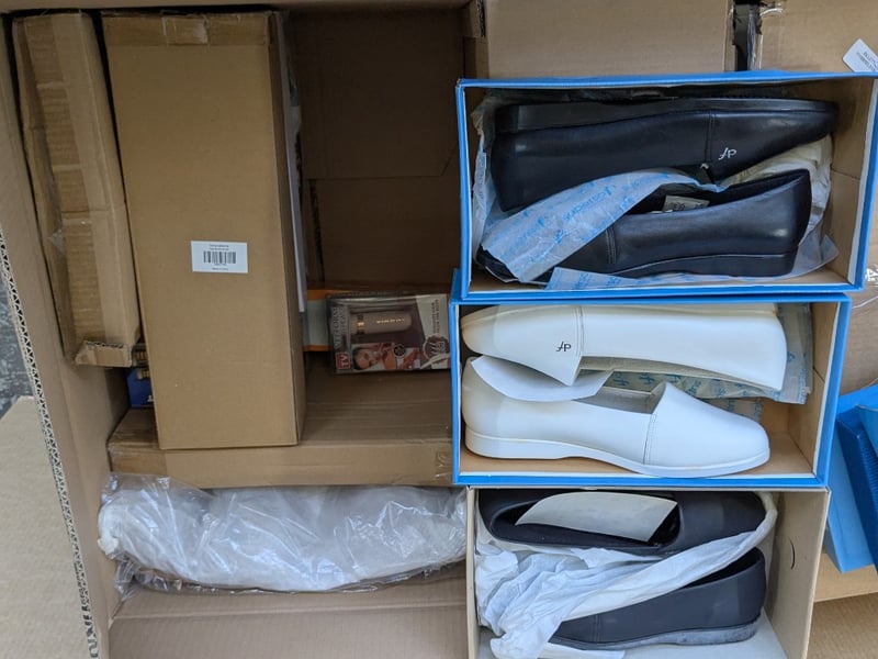 Homewares, 6 boxes including ornaments, electrical goods, kitchenware, women's shoes size 9 and more