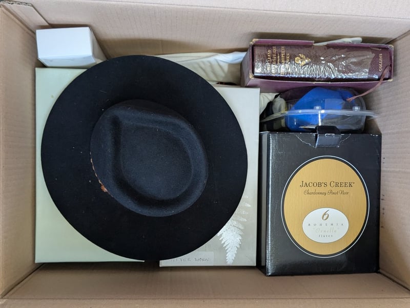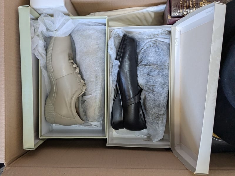 Homewares, 2 boxes including assorted women's shoes, assorted linen and more
