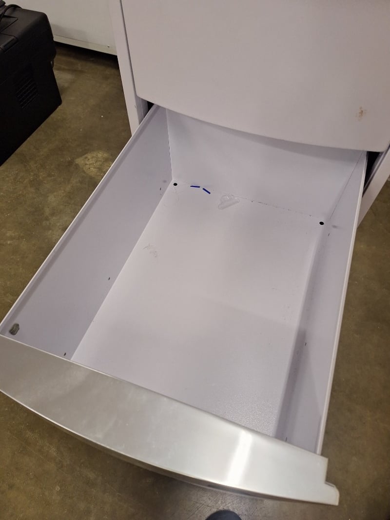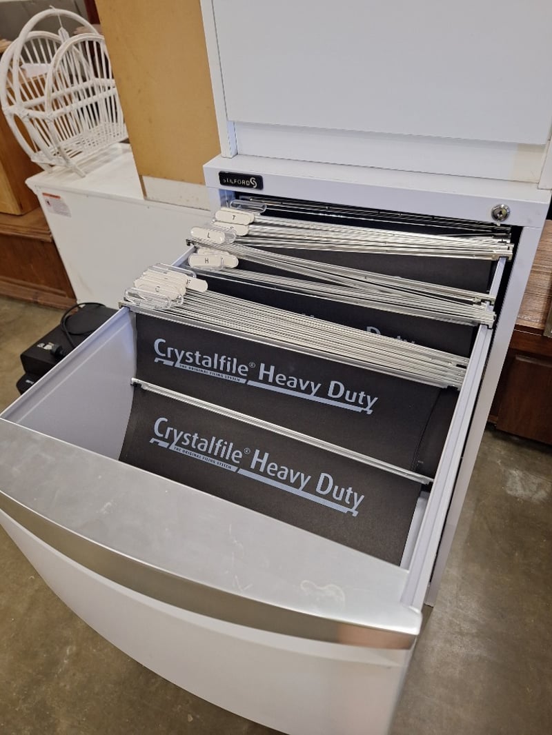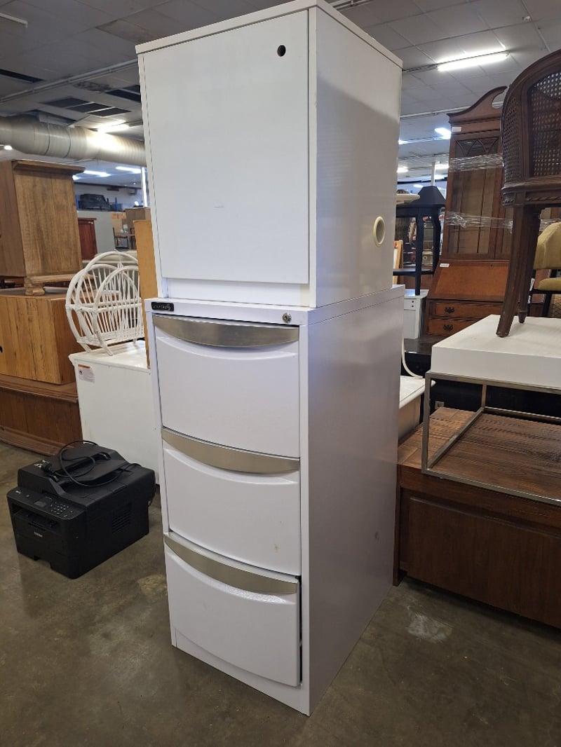 Filing Cabinet & Small Cabinet, No Keys Included, Timber & Metal Style, White FinishDimensions Filling Cabinet H:102cm W:46cm D:59cmDimensions Small Cabinet H:55cm W:45cm D:45cmSOLD AS LOT