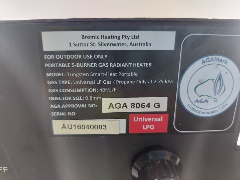 Bromic Tungsten smart-heat portable gas heater.Serial no: AU16040083.Dims: 216cm H, 70cm W, 49cm DNotes: item untested and signs of wear.
