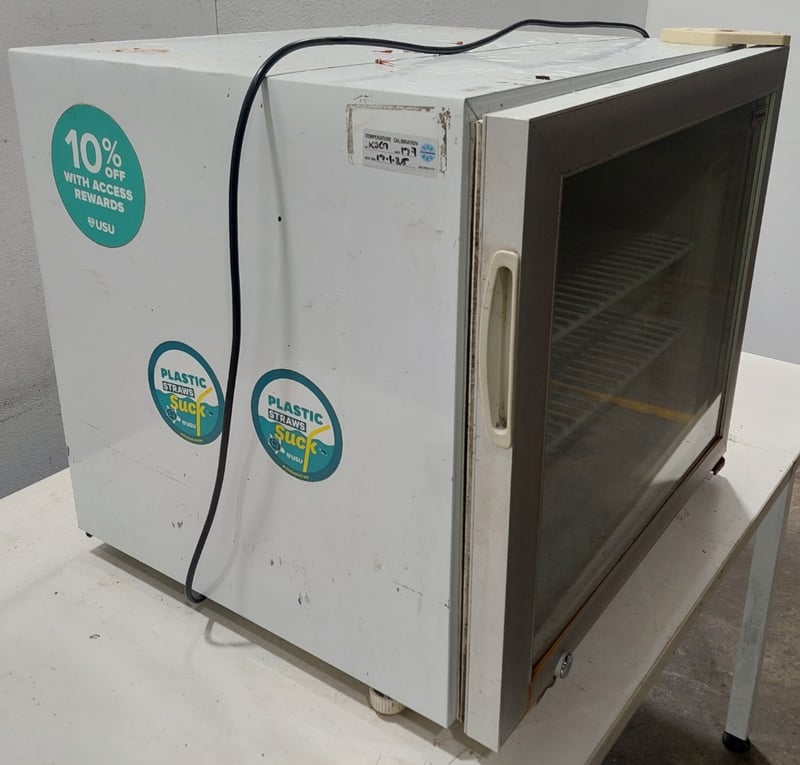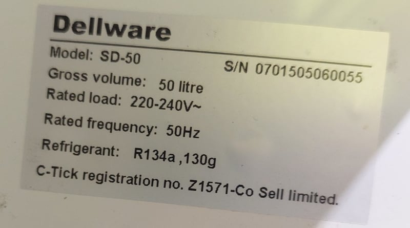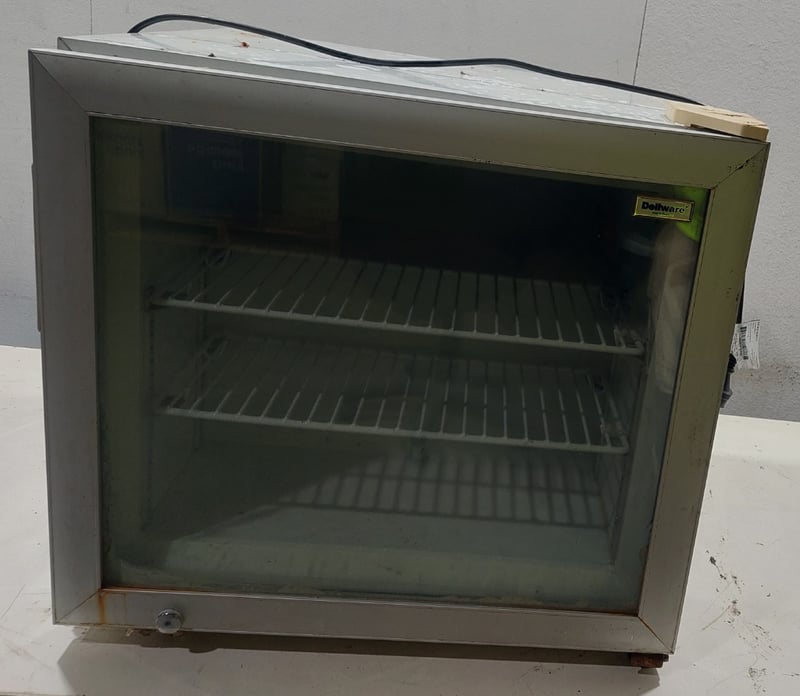 Deliware glass door mini bar fridge.Model number: SD-50Serial number: 07O15O5O6OO55Dims: 50cm x 53cm x 57cmNote: item is untested, signs of wear.