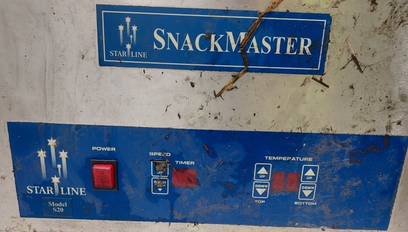 Starling snackmaster commercial conveyor oven.Dims: 44cm H, 92cm W, 61cm D.Model: S20Serial no: C1117Notes: item Untested, signs of wear and missing power cable.