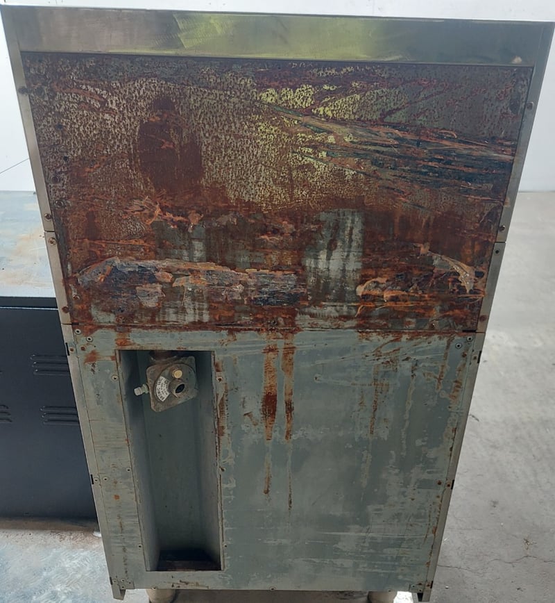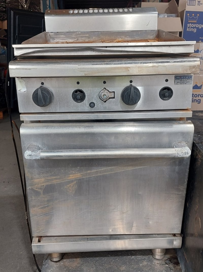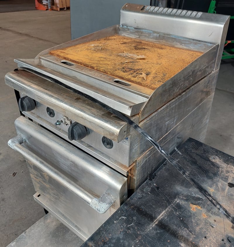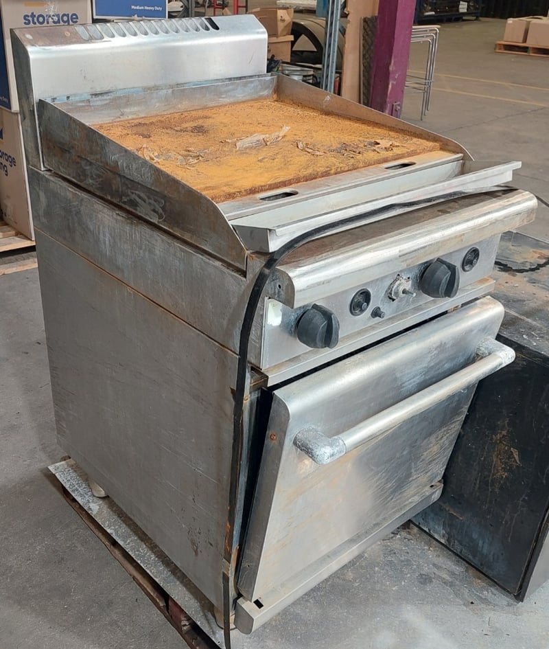 Waldorf 900mm gas griddle, electric static oven range. Dims: 113cm x 85cm x 60cmNote: Signs of wear and tear, untested.