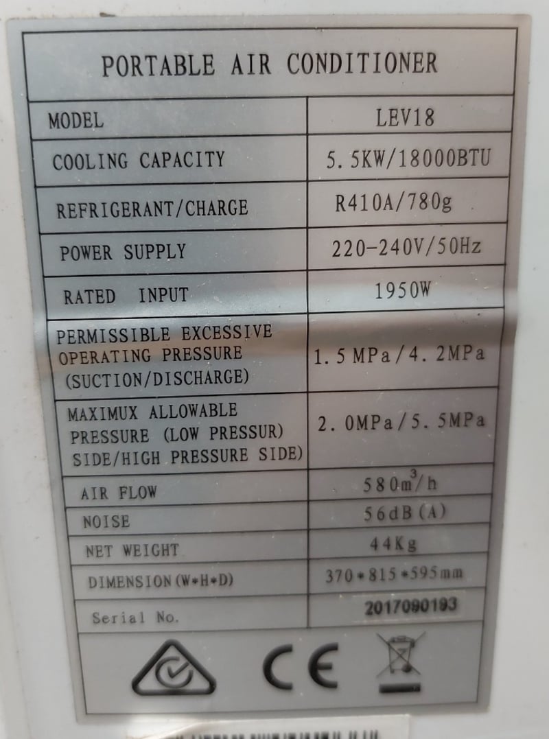 Levante portable air conditioner.Model number: LEV18Serial number: 2017090193Dims: 81cm x 57cm x 38cmNote: Signs of wear and tear, untested.