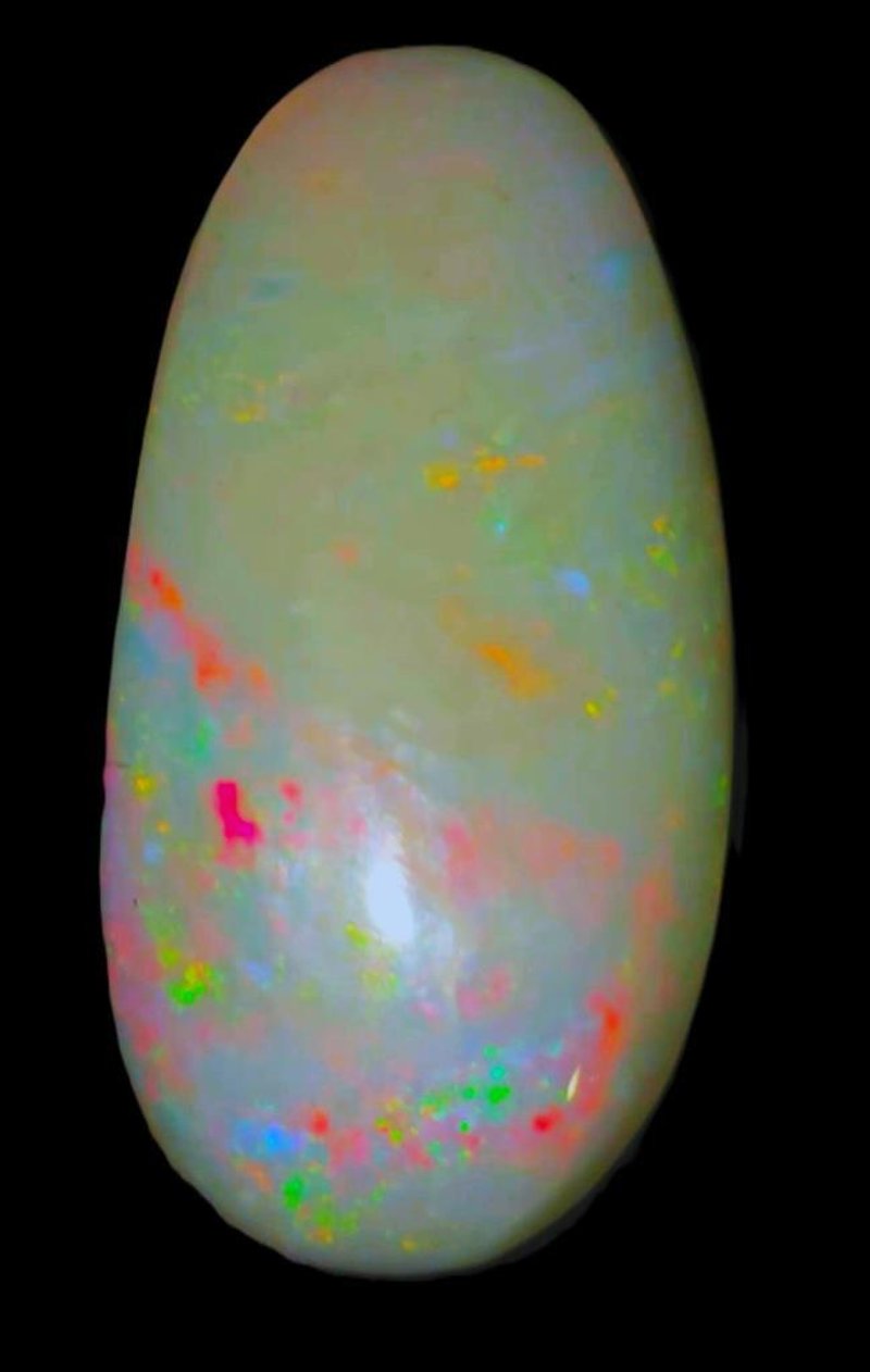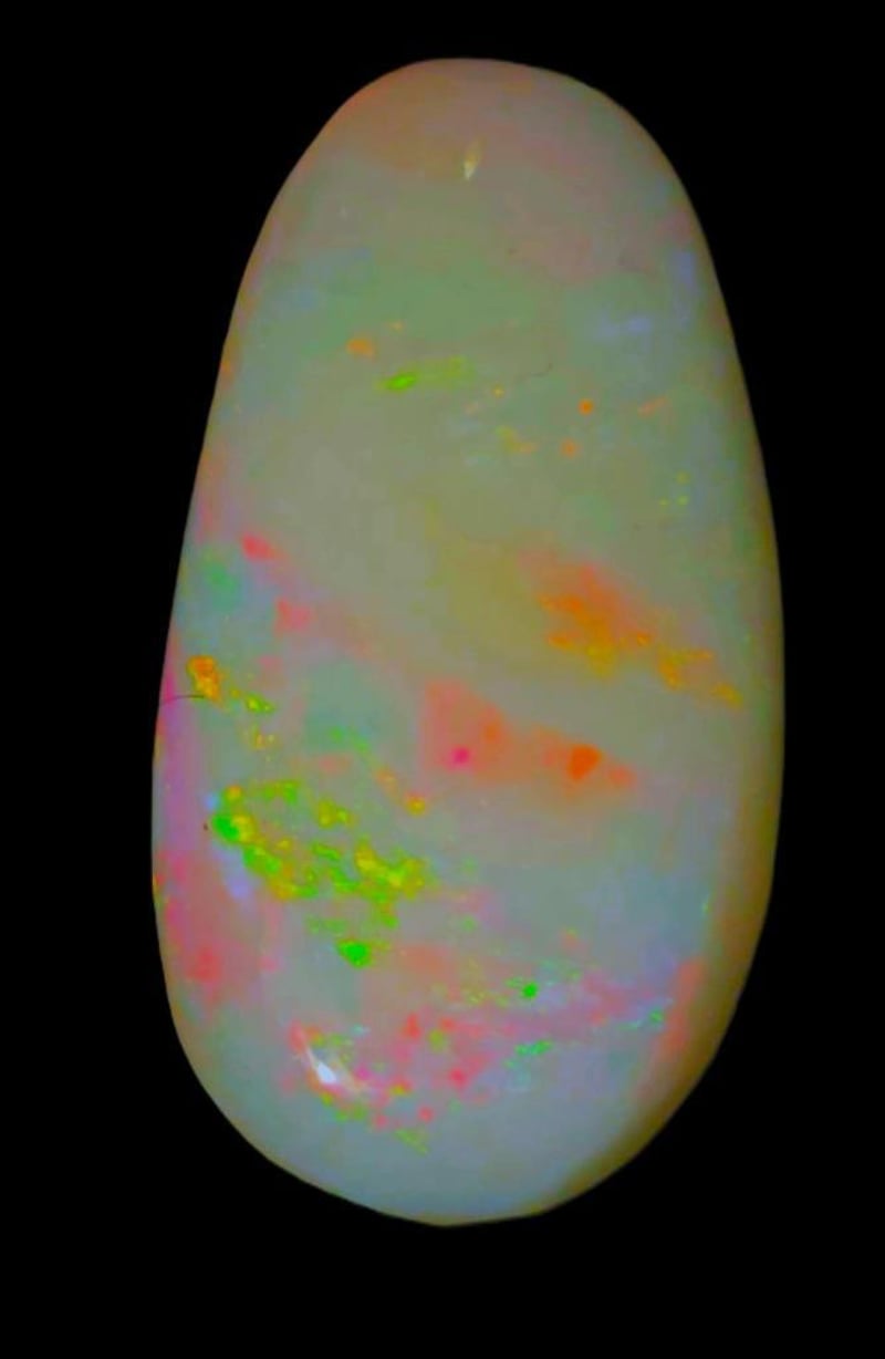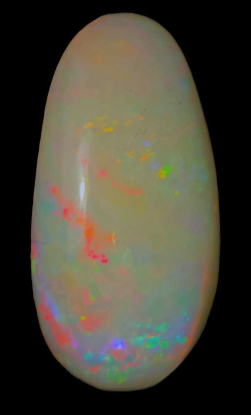 8 CARATS COOBER PEDY WHITE OPAL. Dimensions: 23X11x4mms Quality Stone With Sweeps Of Pinks Teals Yellows Blues Greens, Pendant Drop Cut. No Inclusions, Hard And Stable Opal. R.R.P. $3250 Condition: Good - Refer Images 0+56