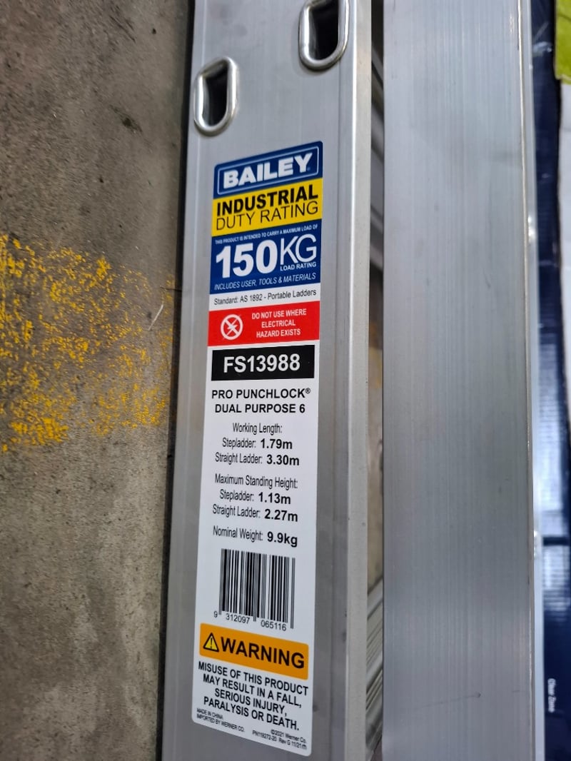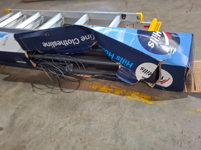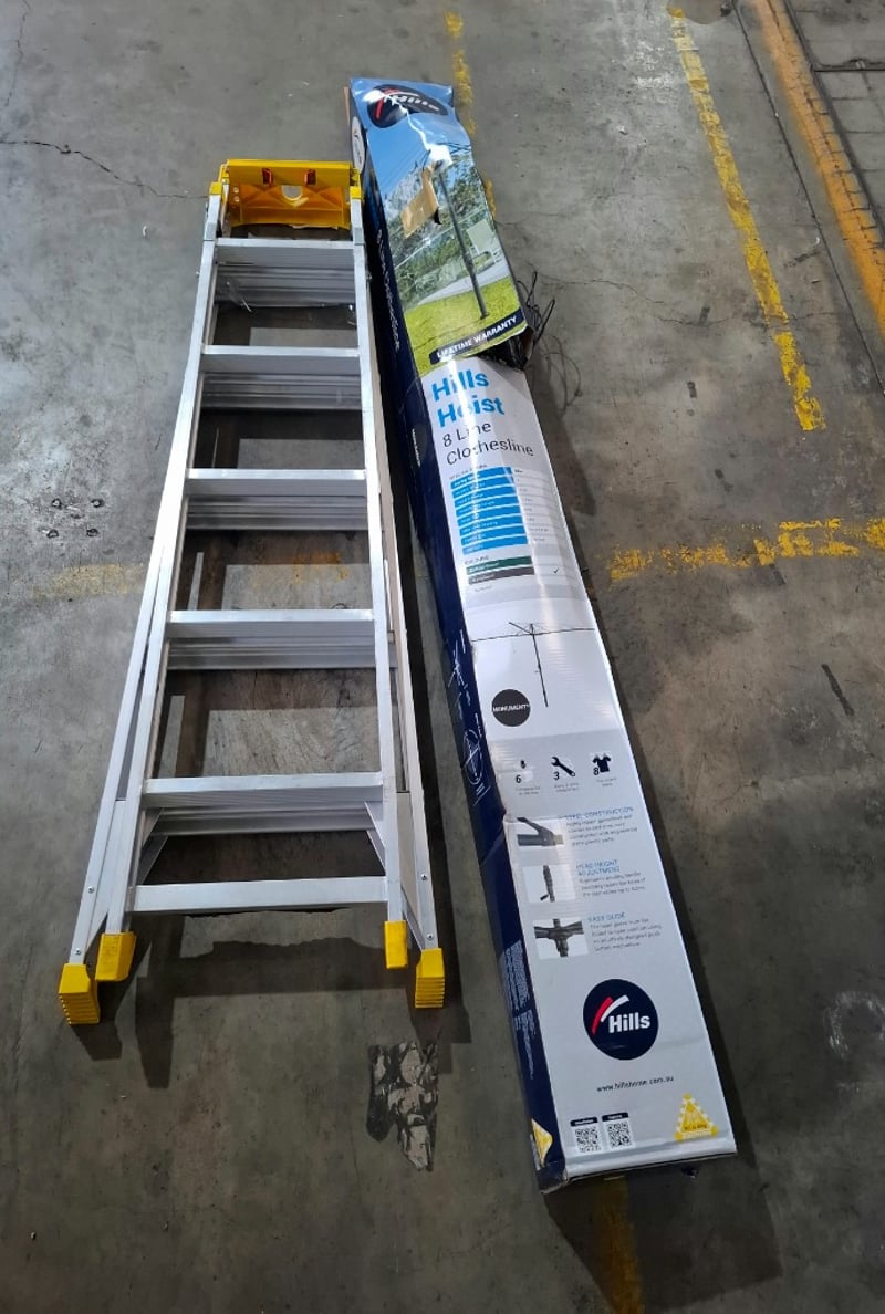 Hils hoist 8 line clotheslines and 150Kg industrial duty portable ladder Sold as lot Note: box damage, items may present dents or missing parts