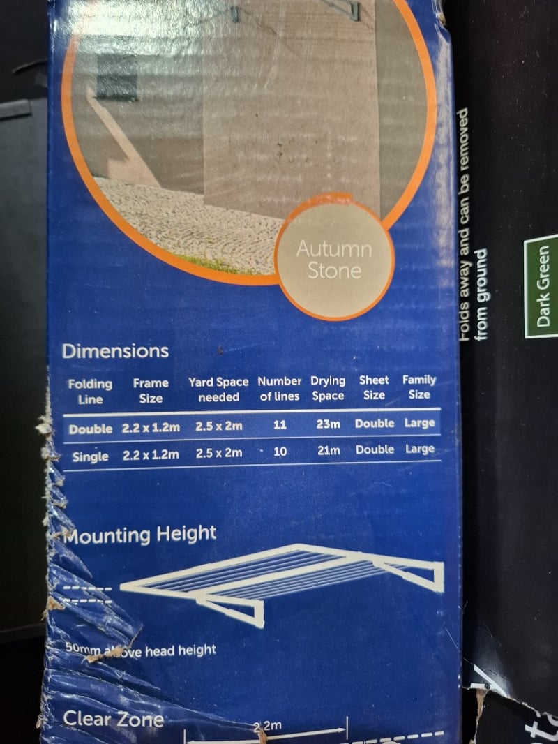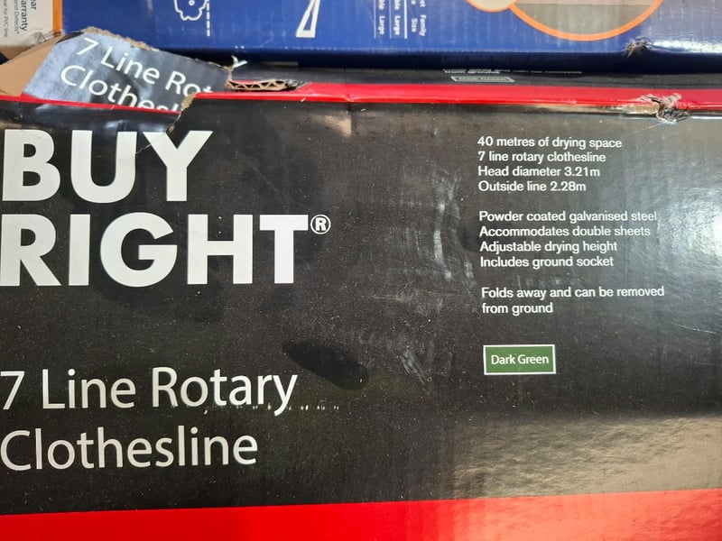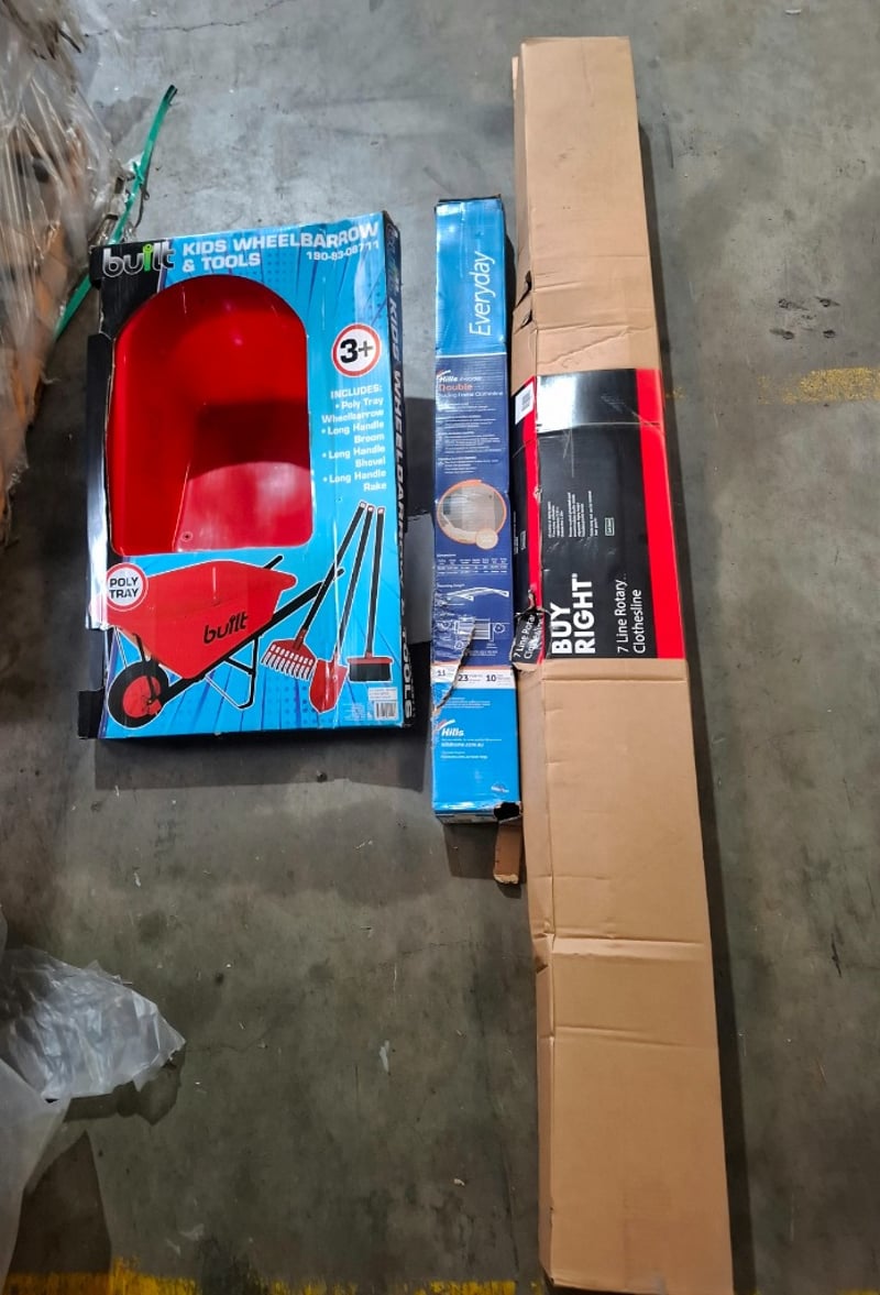Assortment lot includes kids wheelbarrow, duble folding frame clothesline, 7 line rotary clotheslineSold as lotNote: Damage box parts may be missing