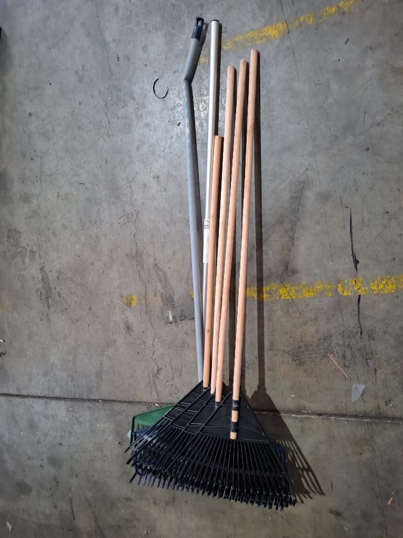 6 x Rake heads plastic, wood/aluminiumNote: bend, and prongs missing