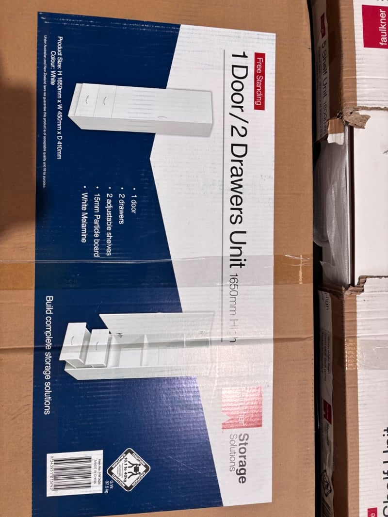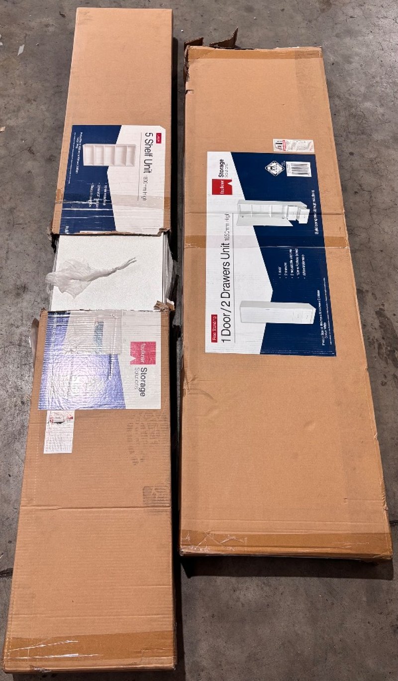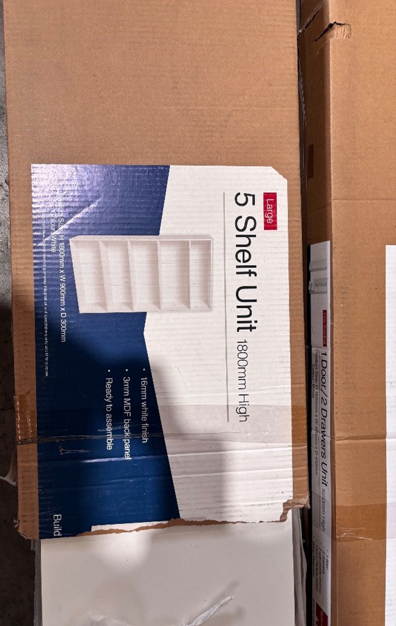 Two storage units white 5 shelf unit and 1 door/2drawers unit.Note; Sold as lot, items maybe have damage (inspection recommended)