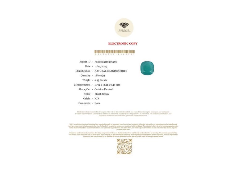 6.35 CARATS NATURAL GRANDIDIERITE 6.35 Carats Natural GrandidieriteCertificate Number - Fgl2025110365583Color - Bluish GreenShape - Cushion FacetedDimension - 11.92 X 12.21 X 6.47 MmOrigin - N/AComments - NoneGood Quality With Luster Condition: Good - Refer Images 0488433+47