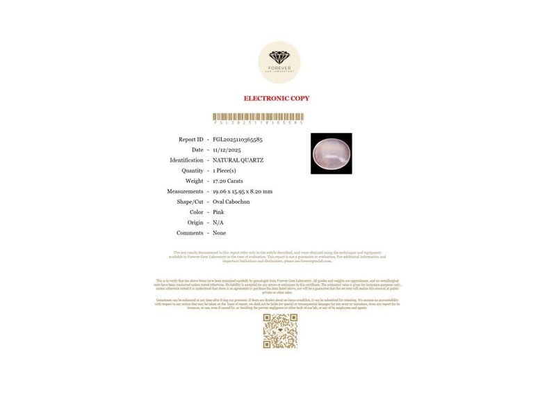17.20 CARATS NATURAL ROSE QUARTZ 17.20 Carats Natural QuartzCertificate Number - Fgl2025110365585Color - PinkShape - Oval CabochonDimension - 19.06 X 15.95 X 8.20 MmOrigin - N/AComments - NoneGood Quality With Luster Condition: Good - Refer Images 0488433+49
