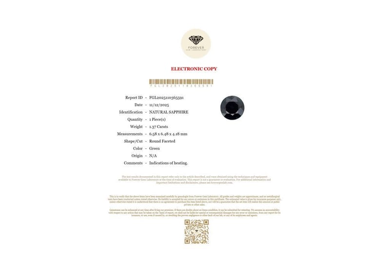 1.37 CARATS NATURAL GREEN SAPPHIRE 1.37 Carats Natural SapphireCertificate Number - Fgl2025110365591Color - GreenShape - Round FacetedDimension - 6.58 X 6.48 X 4.18 MmOrigin - N/AComments - Indications Of Heating.Good Quality With Luster Condition: Good - Refer Images 0488433+55