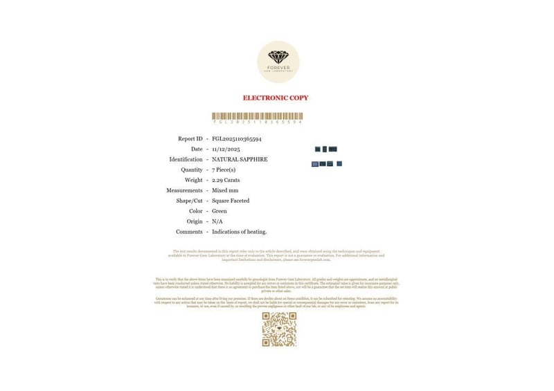 2.29 CARATS NATURAL GREEN SAPPHIRE 2.29 Carats Natural SapphireCertificate Number - Fgl2025110365594Color - GreenShape - Square FacetedDimension - Mixed MmOrigin - N/AComments - Indications Of Heating.Good Quality With Luster Condition: Good - Refer Images 0488433+58